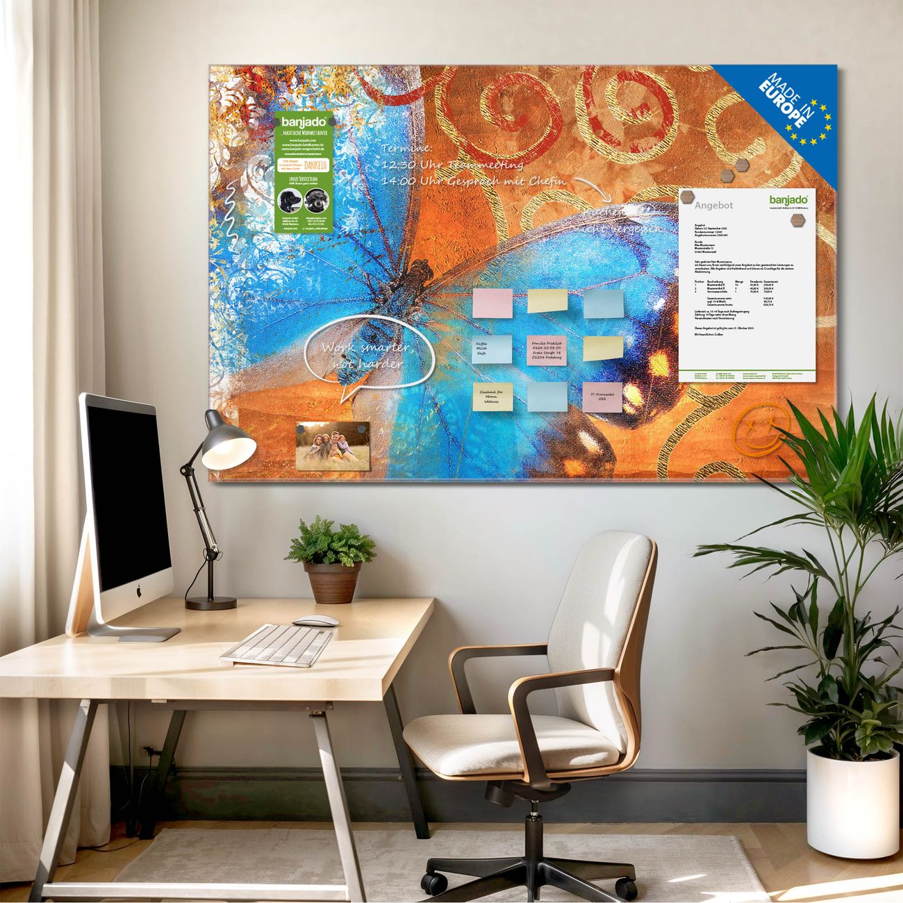 Die banjado Glas Magnettafel mit dem Motiv Motiv Schmetterling verbindet Funktionalität mit Stil. Sie ersetzt das Zettelchaos durch klare Strukturen und bringt dabei eine warme, natürliche Atmosphäre in Ihr Zuhause. Ob im Büro, in der Küche oder im Eingangsbereich - dieses Design-Board zieht Blicke an und sorgt für Ordnung mit Charakter.
