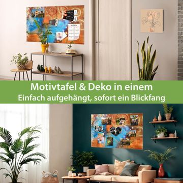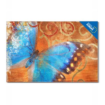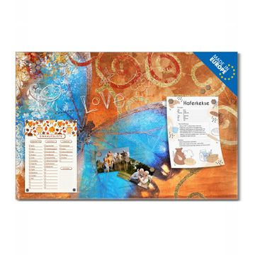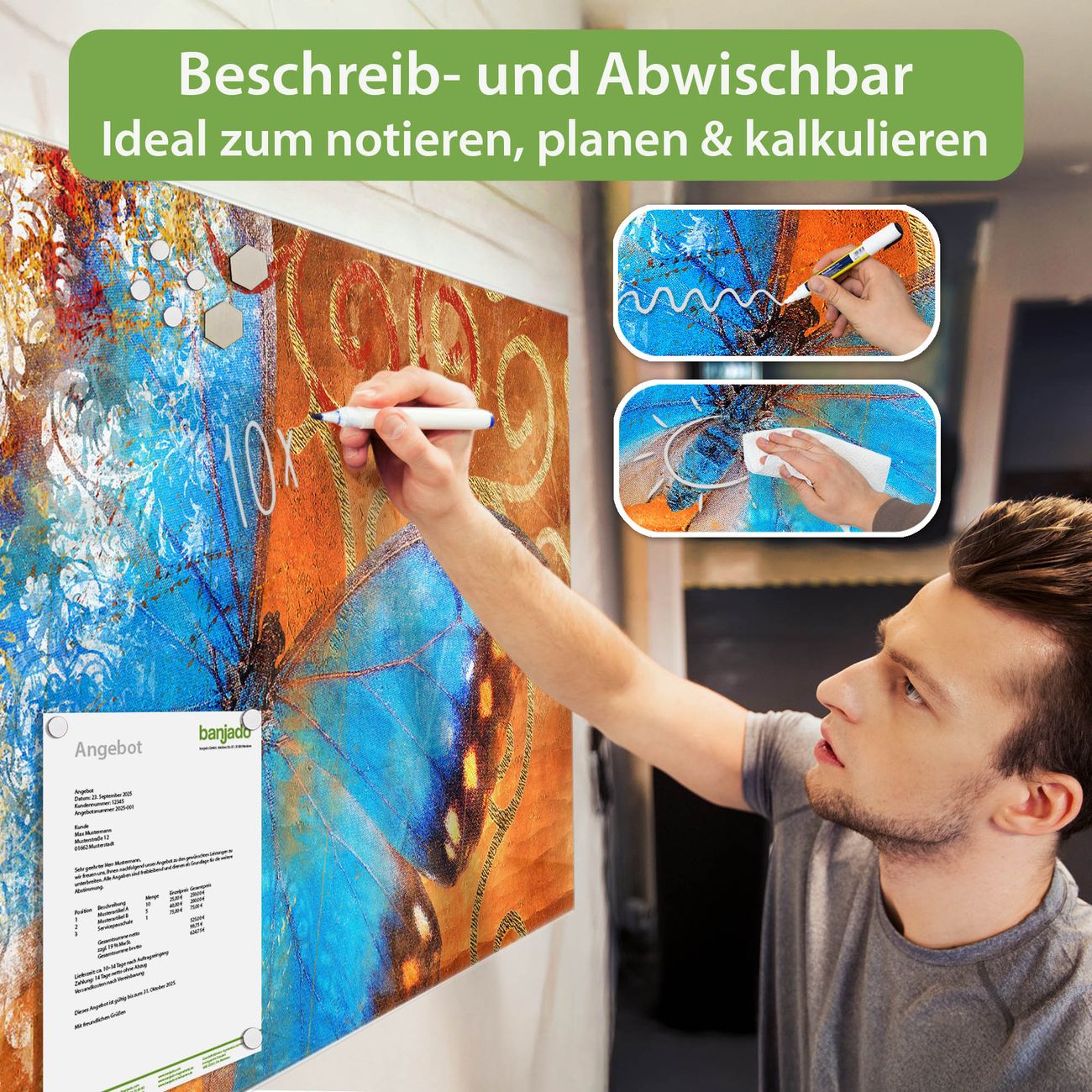 Material: 4mm Sicherheitsglas mit Metallrückwand Eigenschaften: beschreibbar, magnetisch, kratzfest Maße: 75x50x0,6cm, 5,63kg schwer Motiv Nummer 10069 Schmetterling Zubehör: inklusive 4 Neodym-Magnete