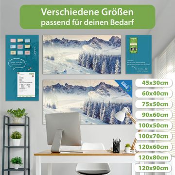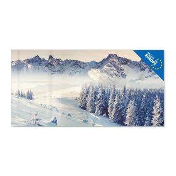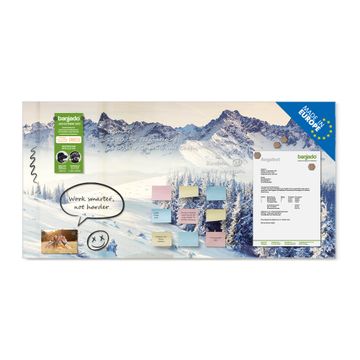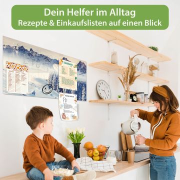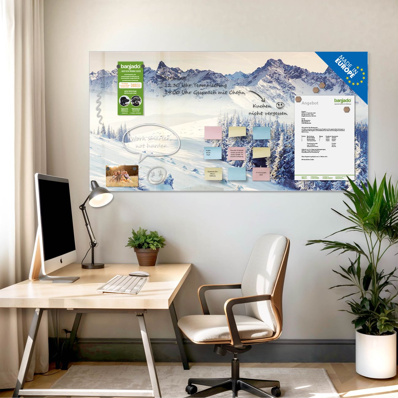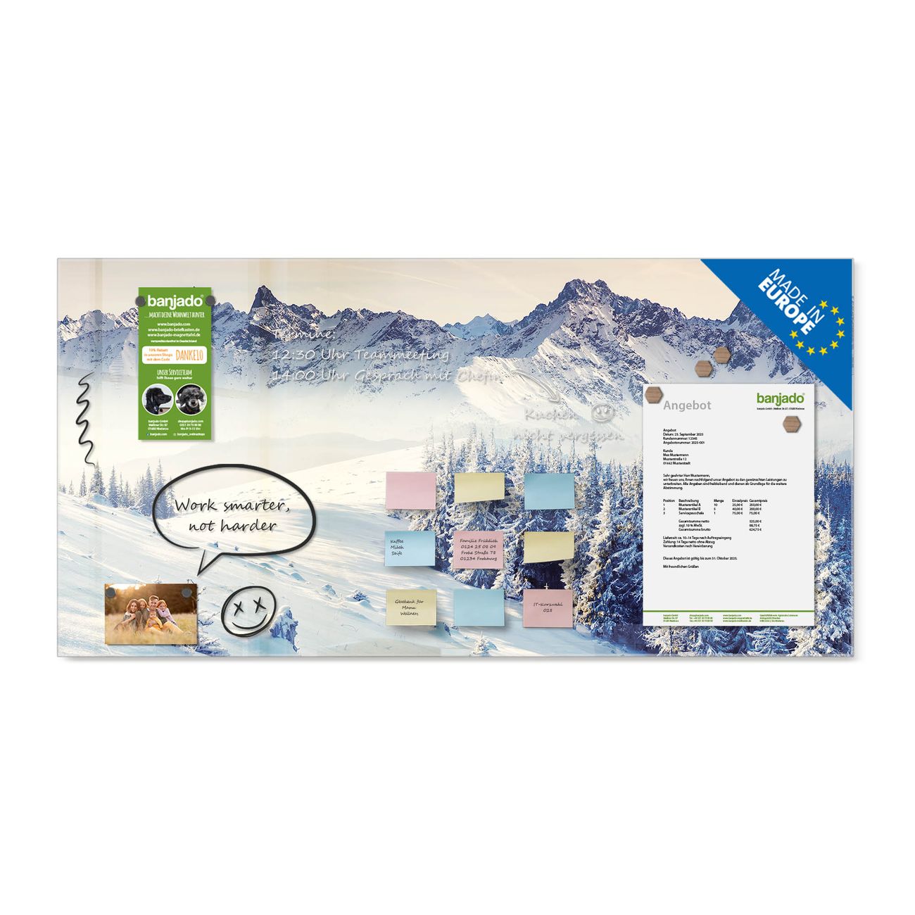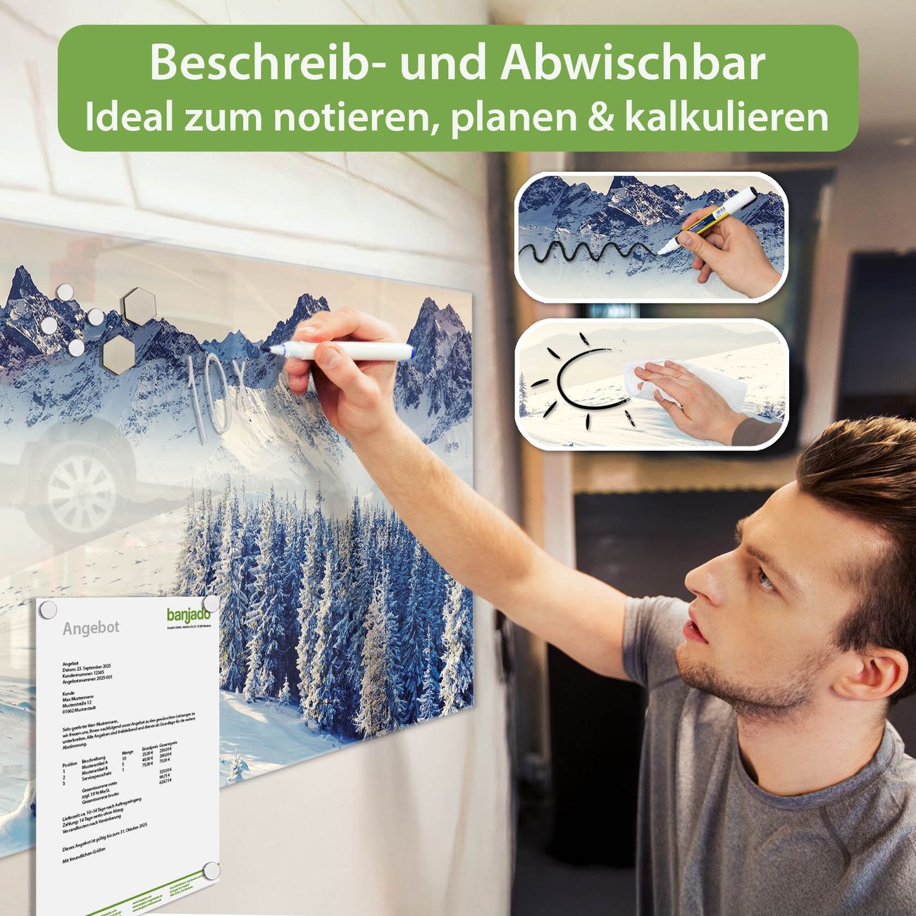 Material: 4mm Sicherheitsglas mit Metallrückwand Eigenschaften: beschreibbar, magnetisch, kratzfest Maße: 100x50x0,6cm, 7,50kg schwer Motiv Nummer 11174 Schneebedeckte Berge Zubehör: inklusive 4 Neodym-Magnete