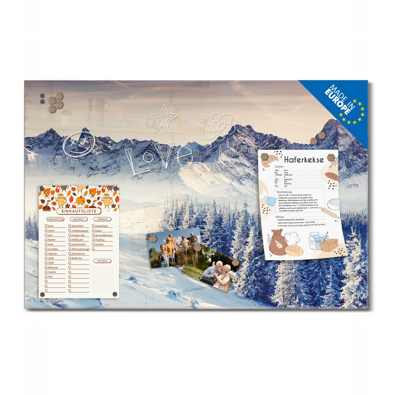 Material: 4mm Sicherheitsglas mit Metallrückwand Eigenschaften: beschreibbar, magnetisch, kratzfest Maße: 75x50x0,6cm, 5,63kg schwer Motiv Nummer 11174 Schneebedeckte Berge Zubehör: inklusive 4 Neodym-Magnete