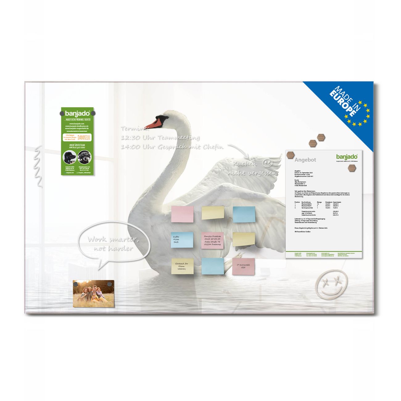 Material: 4mm Sicherheitsglas mit Metallrückwand Eigenschaften: beschreibbar, magnetisch, kratzfest Maße: 120x80x0,6cm, 14,40kg schwer Motiv Nummer 10299 Schwan Zubehör: inklusive 4 Neodym-Magnete