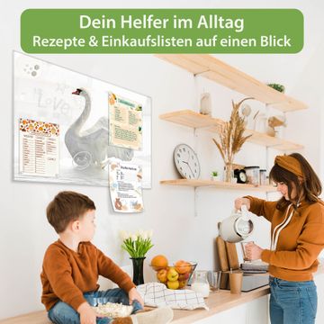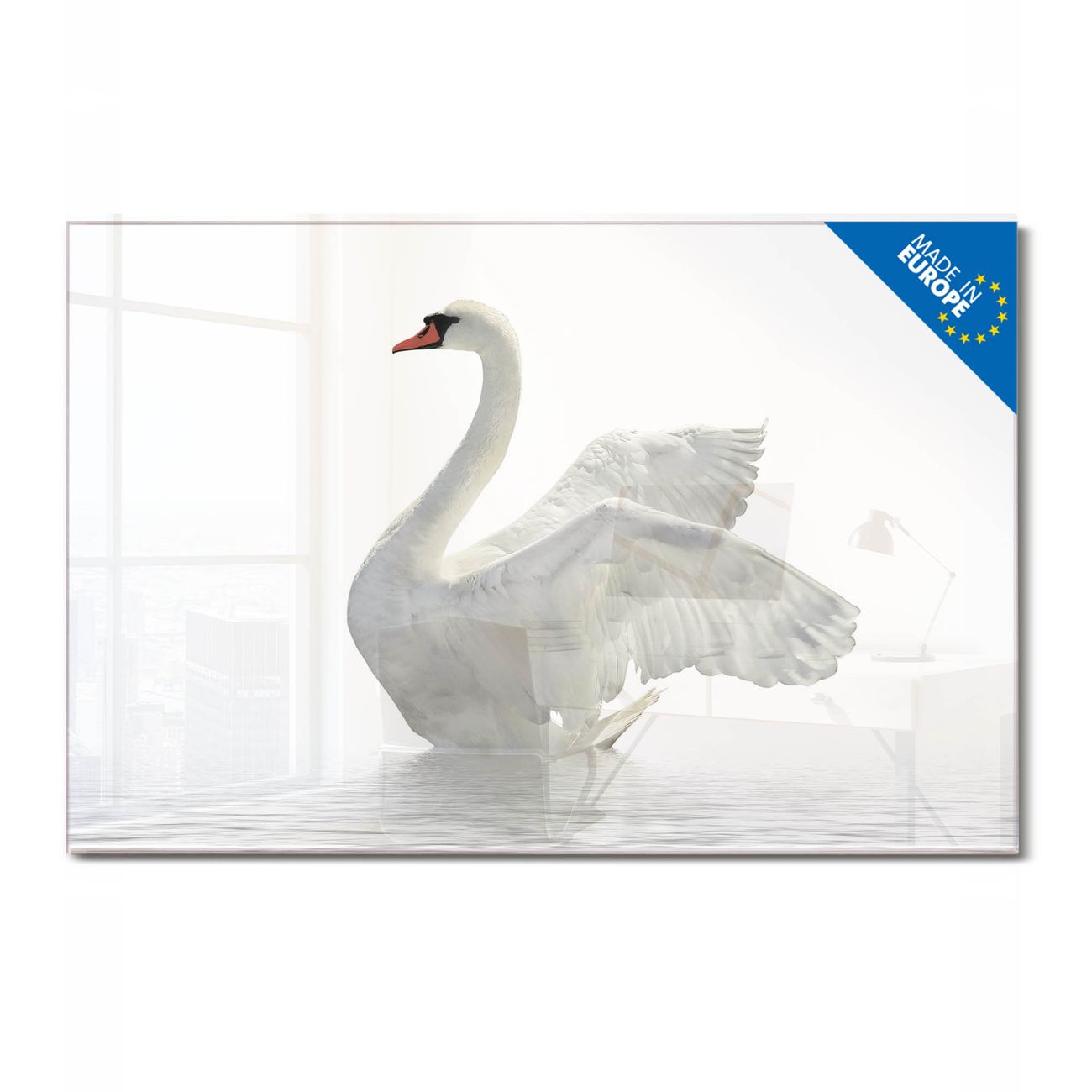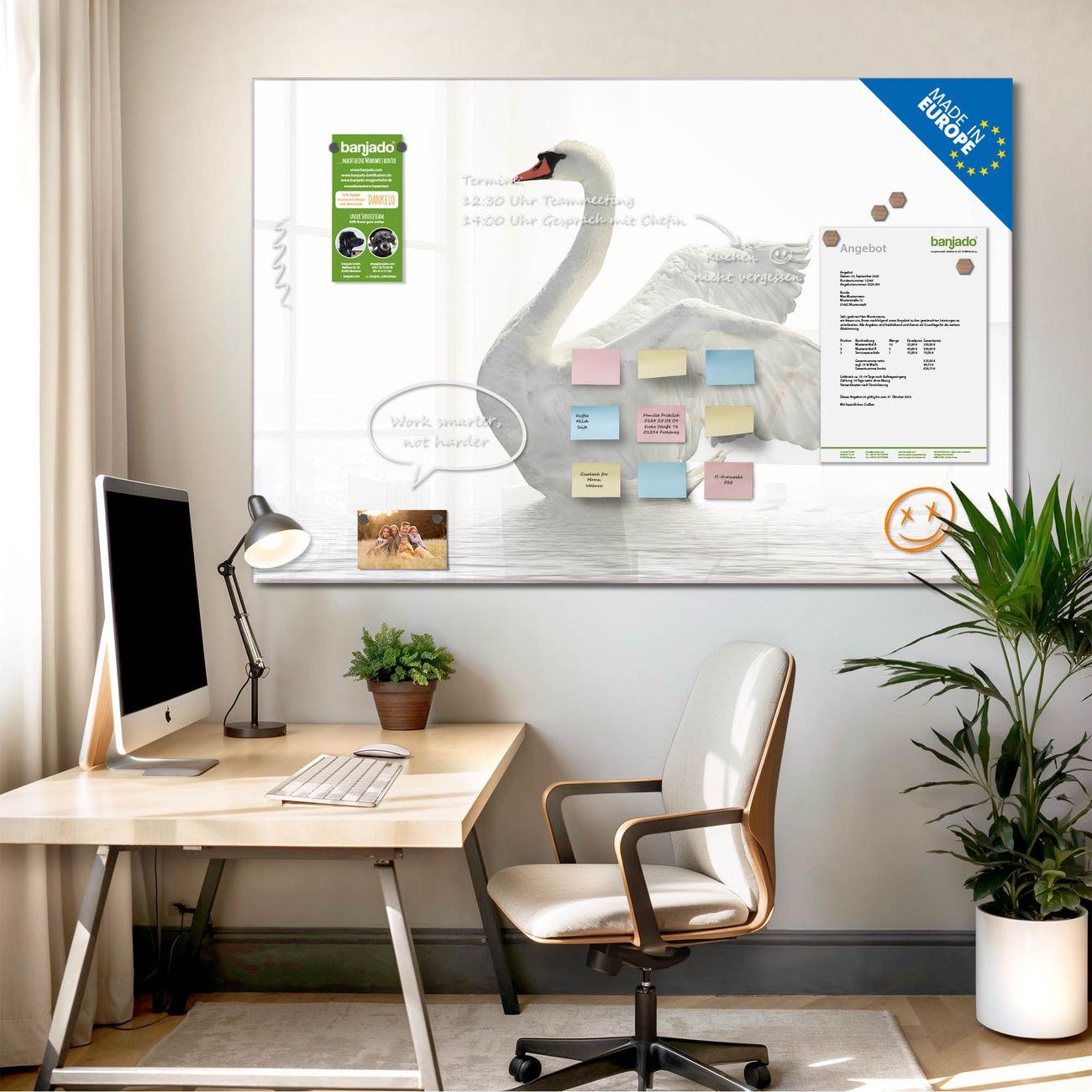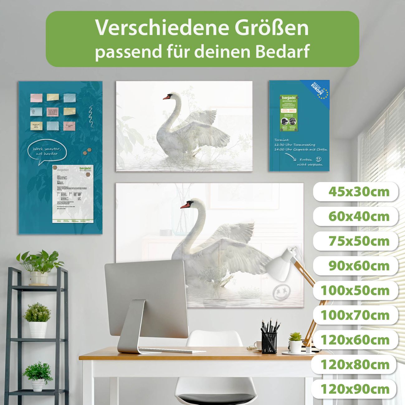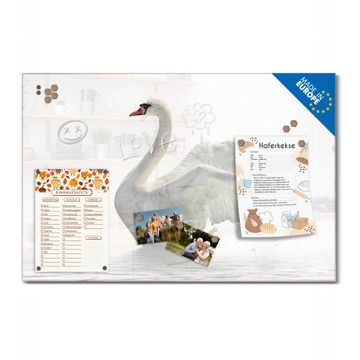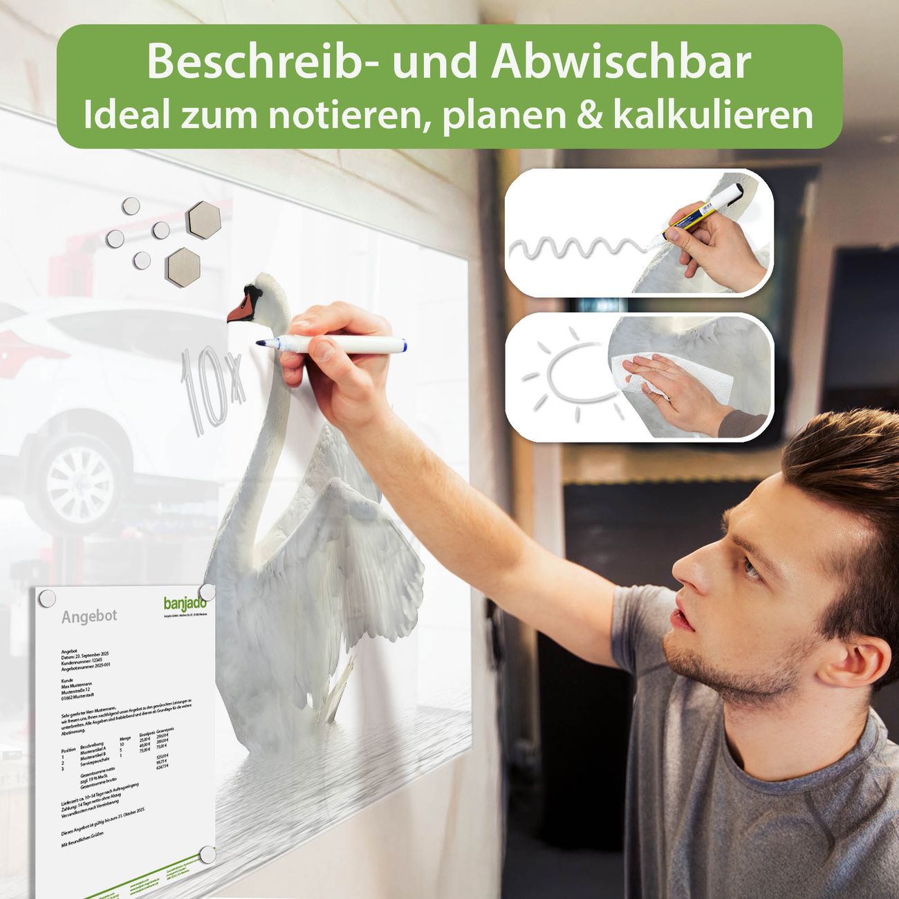 Material: 4mm Sicherheitsglas mit Metallrückwand Eigenschaften: beschreibbar, magnetisch, kratzfest Maße: 75x50x0,6cm, 5,63kg schwer Motiv Nummer 10299 Schwan Zubehör: inklusive 4 Neodym-Magnete