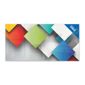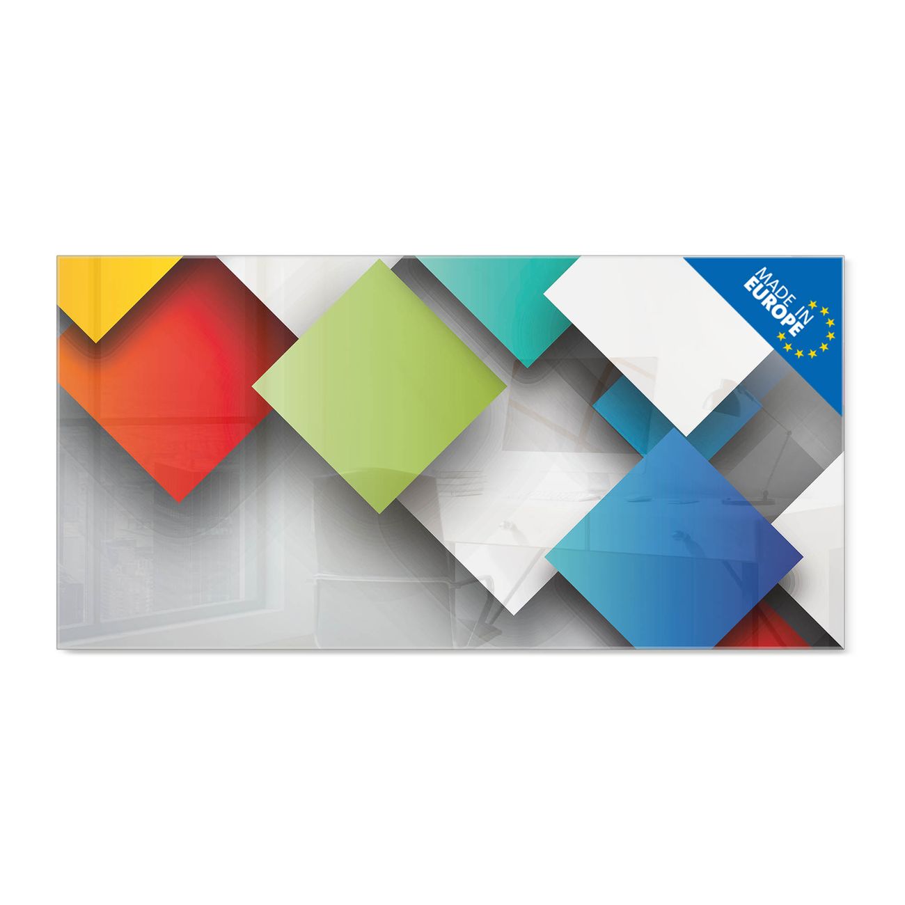 Material: 4mm Sicherheitsglas mit Metallrückwand Eigenschaften: beschreibbar, magnetisch, kratzfest Maße: 100x50x0,6cm, 7,50kg schwer Motiv Nummer 10744 Schwebende Quadrate Zubehör: inklusive 4 Neodym-Magnete