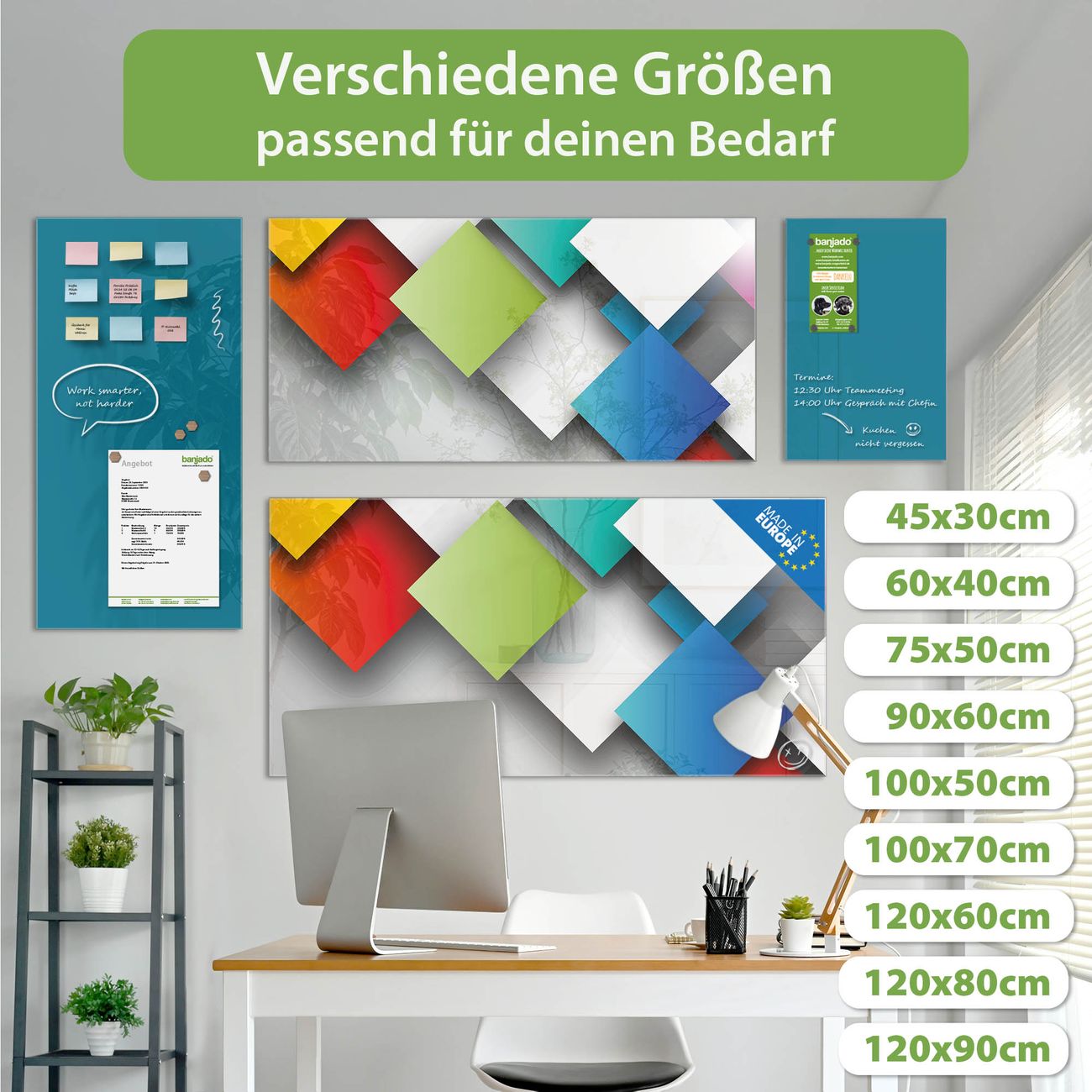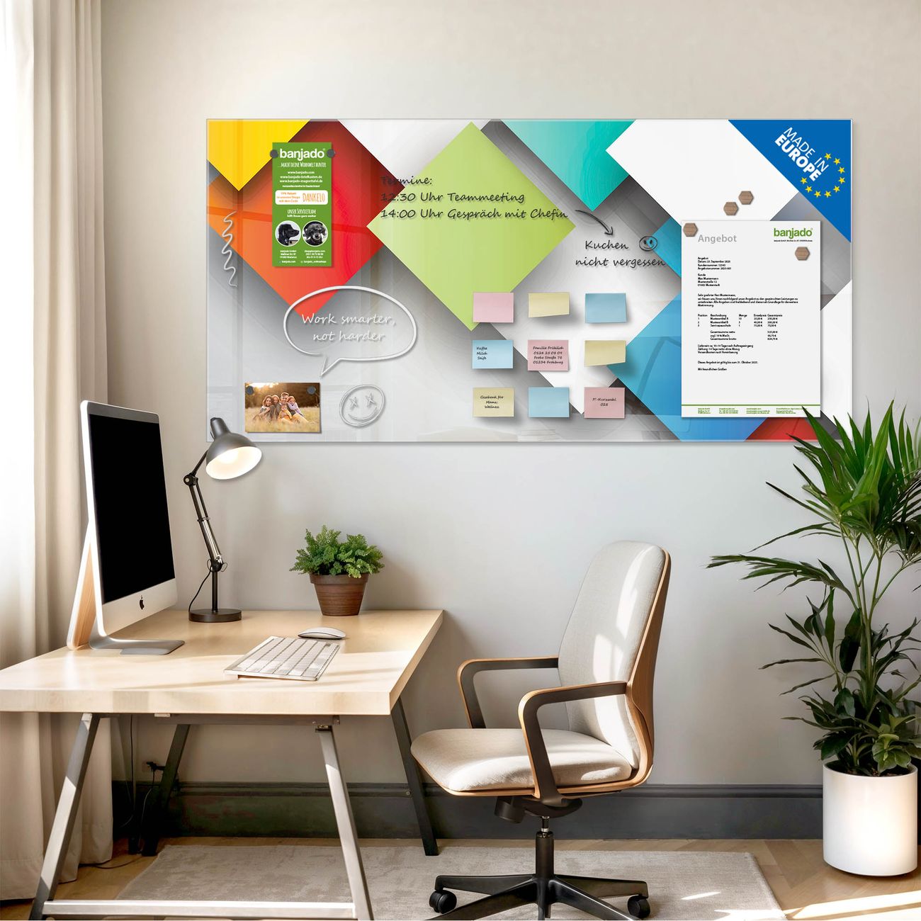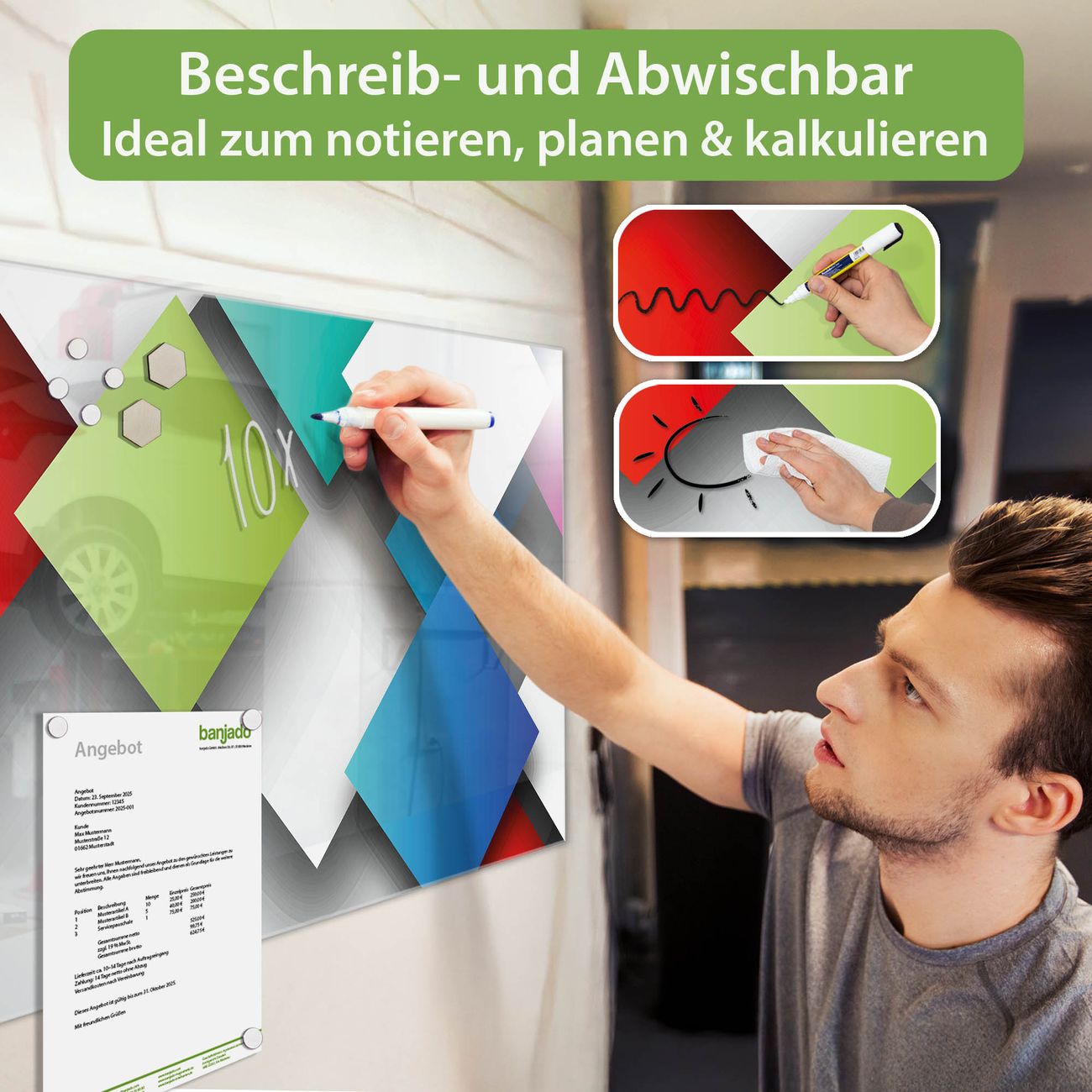 Jede Glas Magnettafel wird in unserer Werkstatt von Hand gefertigt und sorgfältig geprüft. So erhalten Sie ein echtes Qualitätsprodukt, das Funktion und Ästhetik perfekt vereint.?? Warum banjado?