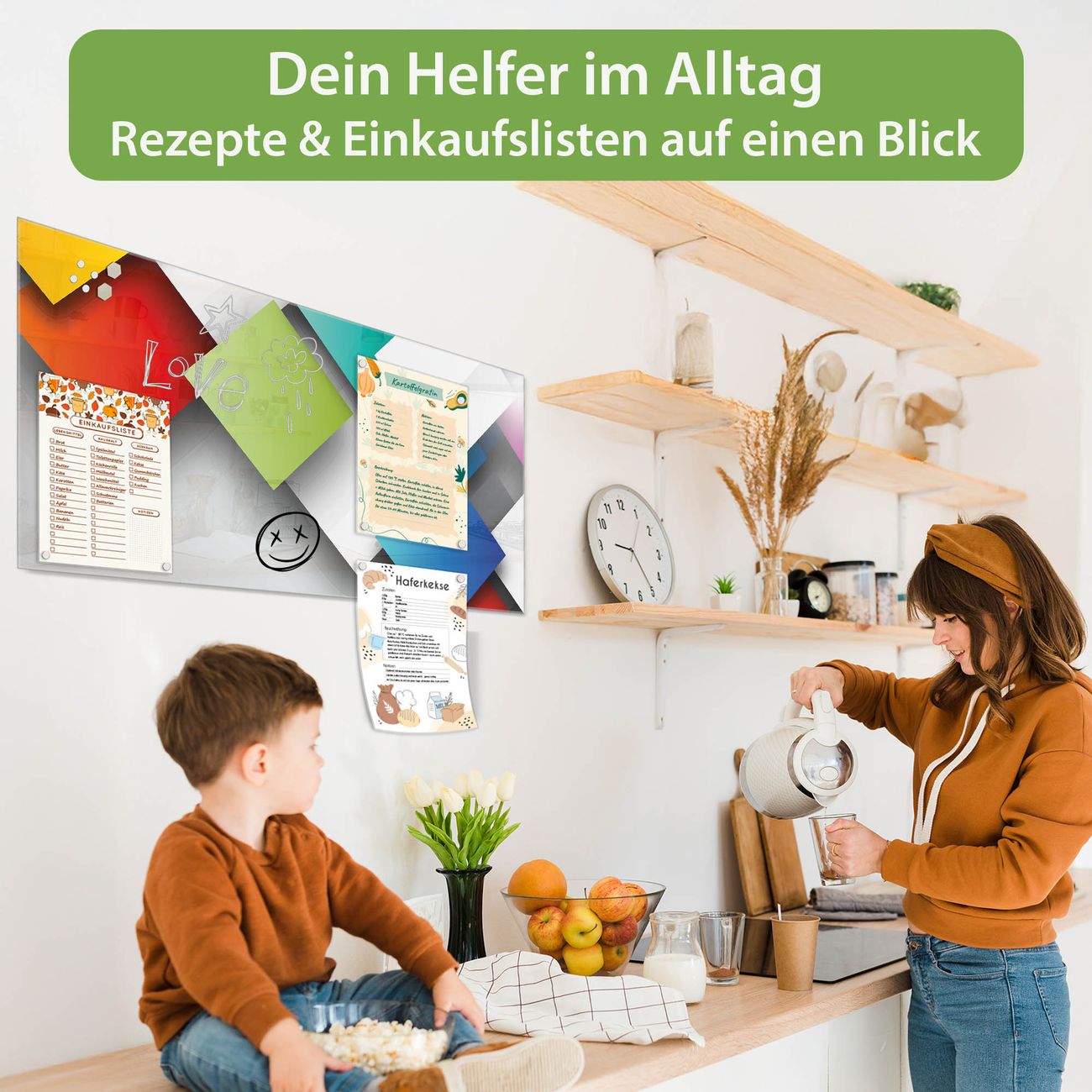 Auf der glatten Glasoberfläche lassen sich Termine, Rezepte oder Notizen ganz einfach mit Kreidestiften festhalten und rückstandslos entfernen. Starke Neodym-Magnete halten Ihre wichtigsten Erinnerungen sicher an Ort und Stelle. So entsteht Ihre ganz persönliche Ideenwand - jeden Tag neu.