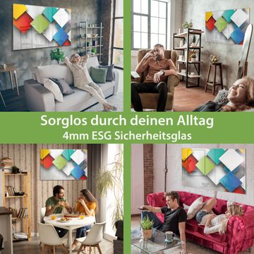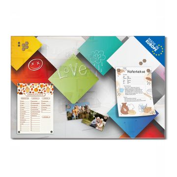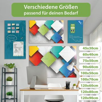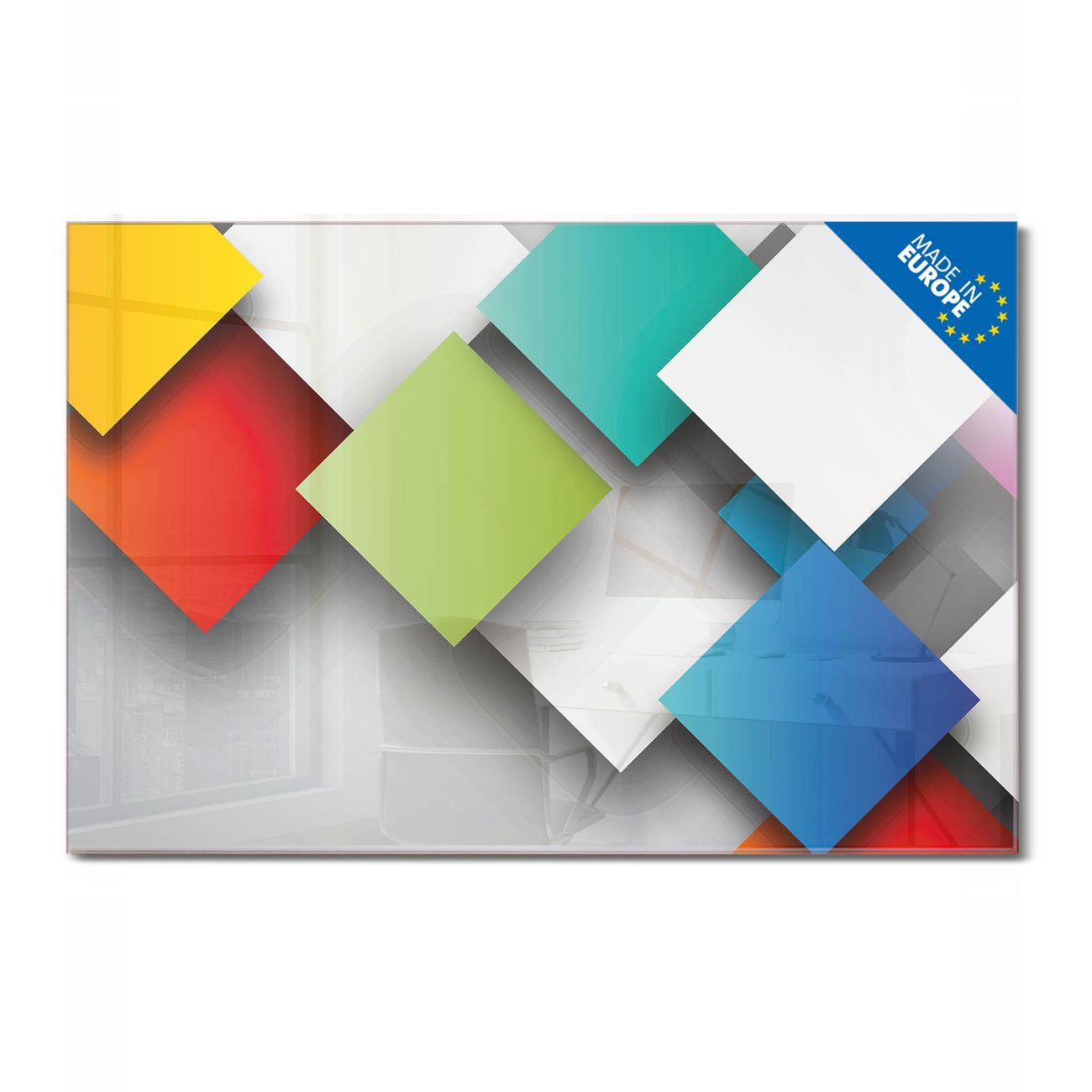 Material: 4mm Sicherheitsglas mit Metallrückwand Eigenschaften: beschreibbar, magnetisch, kratzfest Maße: 45x30x0,6cm, 2,03kg schwer Motiv Nummer 10744 Schwebende Quadrate Zubehör: inklusive 4 Neodym-Magnete