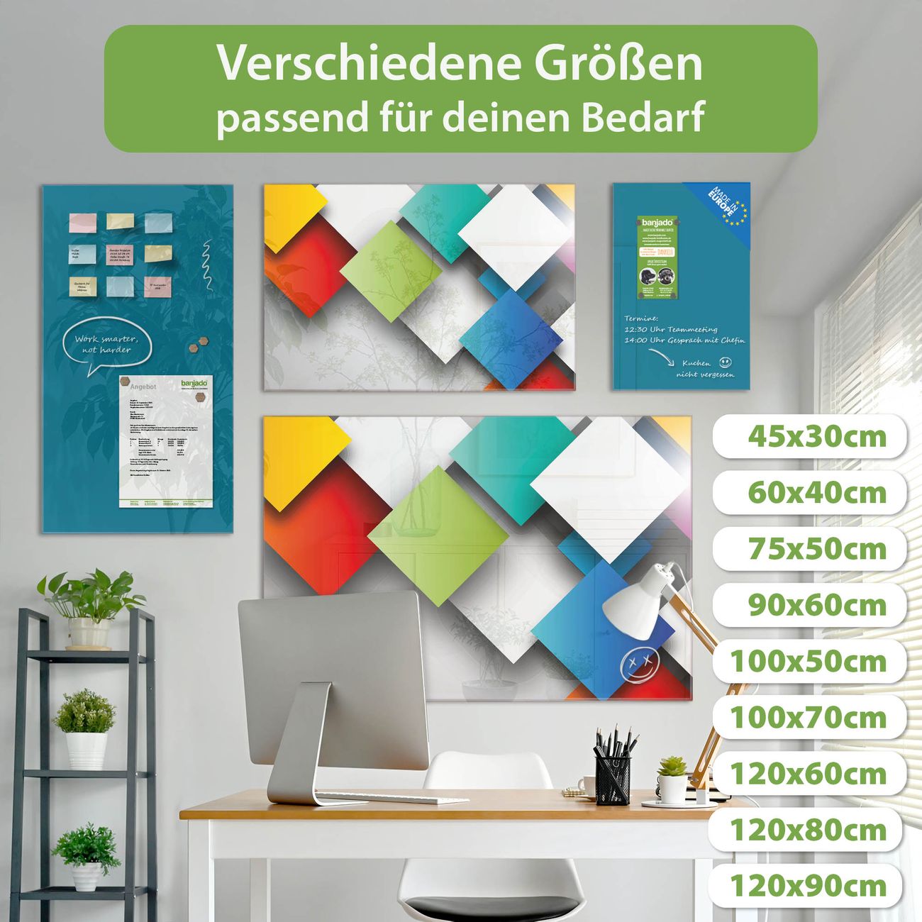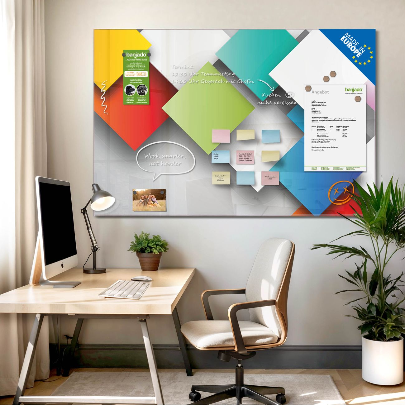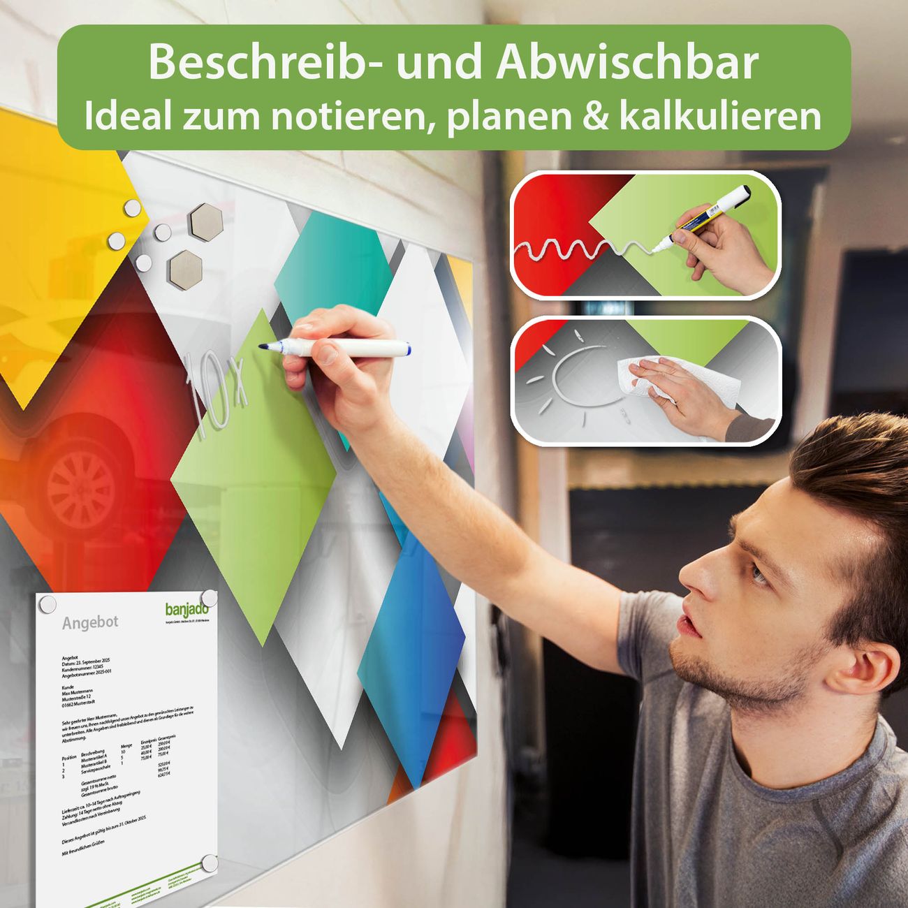 Jede Glas Magnettafel wird in unserer Werkstatt von Hand gefertigt und sorgfältig geprüft. So erhalten Sie ein echtes Qualitätsprodukt, das Funktion und Ästhetik perfekt vereint.?? Warum banjado?