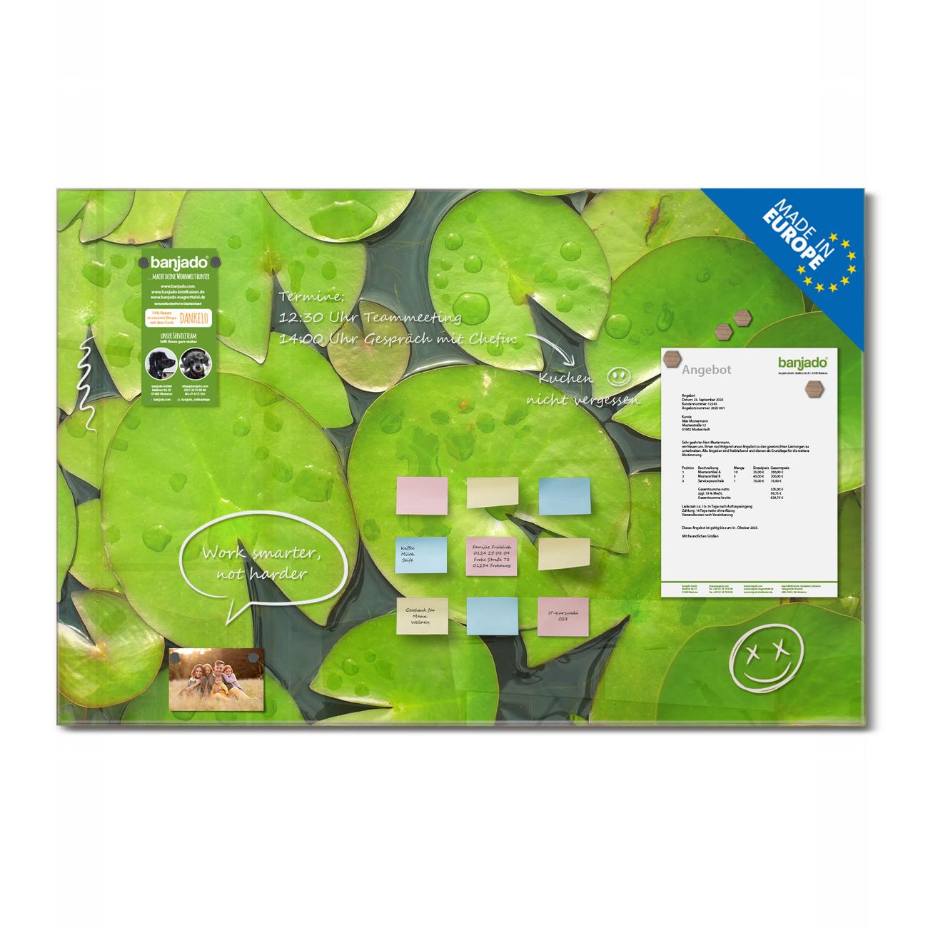 Jede Glas Magnettafel wird in unserer Werkstatt von Hand gefertigt und sorgfältig geprüft. So erhalten Sie ein echtes Qualitätsprodukt, das Funktion und Ästhetik perfekt vereint.?? Warum banjado?