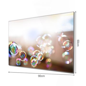 Material: 4mm Sicherheitsglas mit Metallrückwand Eigenschaften: beschreibbar, magnetisch, kratzfest Maße: 90x60x0,6cm, 8,10kg schwer Motiv Nummer 12441 Seifenblasen Zubehör: inklusive 4 Neodym-Magnete