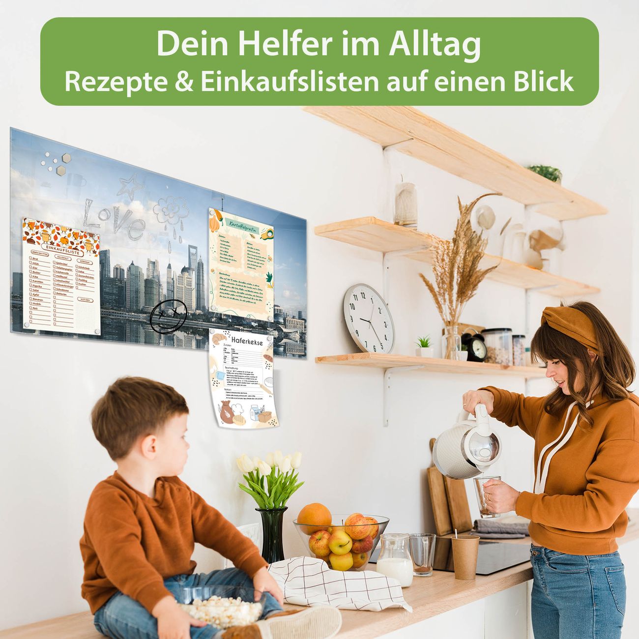Auf der glatten Glasoberfläche lassen sich Termine, Rezepte oder Notizen ganz einfach mit Kreidestiften festhalten und rückstandslos entfernen. Starke Neodym-Magnete halten Ihre wichtigsten Erinnerungen sicher an Ort und Stelle. So entsteht Ihre ganz persönliche Ideenwand - jeden Tag neu.