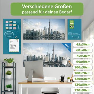 Material: 4mm Sicherheitsglas mit Metallrückwand Eigenschaften: beschreibbar, magnetisch, kratzfest Maße: 100x50x0,6cm, 7,50kg schwer Motiv Nummer 12410 Shanghai Zubehör: inklusive 4 Neodym-Magnete