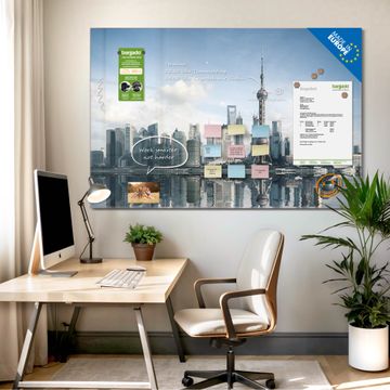 Material: 4mm Sicherheitsglas mit Metallrückwand Eigenschaften: beschreibbar, magnetisch, kratzfest Maße: 75x50x0,6cm, 5,63kg schwer Motiv Nummer 12410 Shanghai Zubehör: inklusive 4 Neodym-Magnete