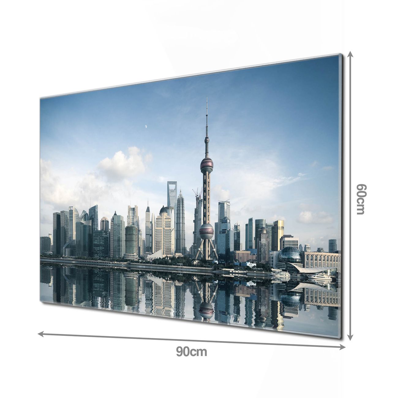 Material: 4mm Sicherheitsglas mit Metallrückwand Eigenschaften: beschreibbar, magnetisch, kratzfest Maße: 90x60x0,6cm, 8,10kg schwer Motiv Nummer 12410 Shanghai Zubehör: inklusive 4 Neodym-Magnete