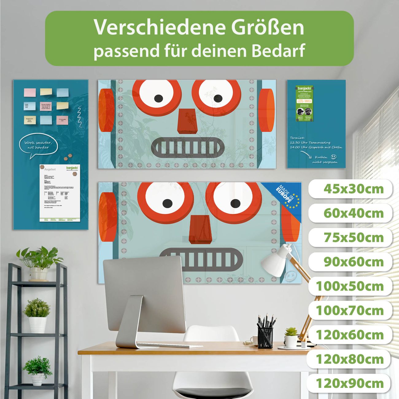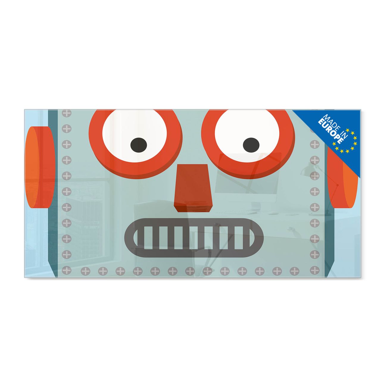 Material: 4mm Sicherheitsglas mit Metallrückwand Eigenschaften: beschreibbar, magnetisch, kratzfest Maße: 100x50x0,6cm, 7,50kg schwer Motiv Nummer 11807 Shocked Robot Zubehör: inklusive 4 Neodym-Magnete