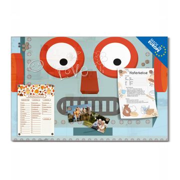 Material: 4mm Sicherheitsglas mit Metallrückwand Eigenschaften: beschreibbar, magnetisch, kratzfest Maße: 75x50x0,6cm, 5,63kg schwer Motiv Nummer 11807 Shocked Robot Zubehör: inklusive 4 Neodym-Magnete