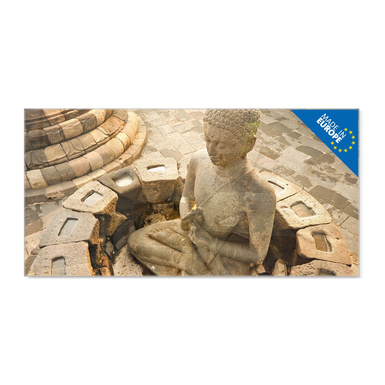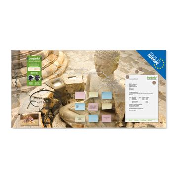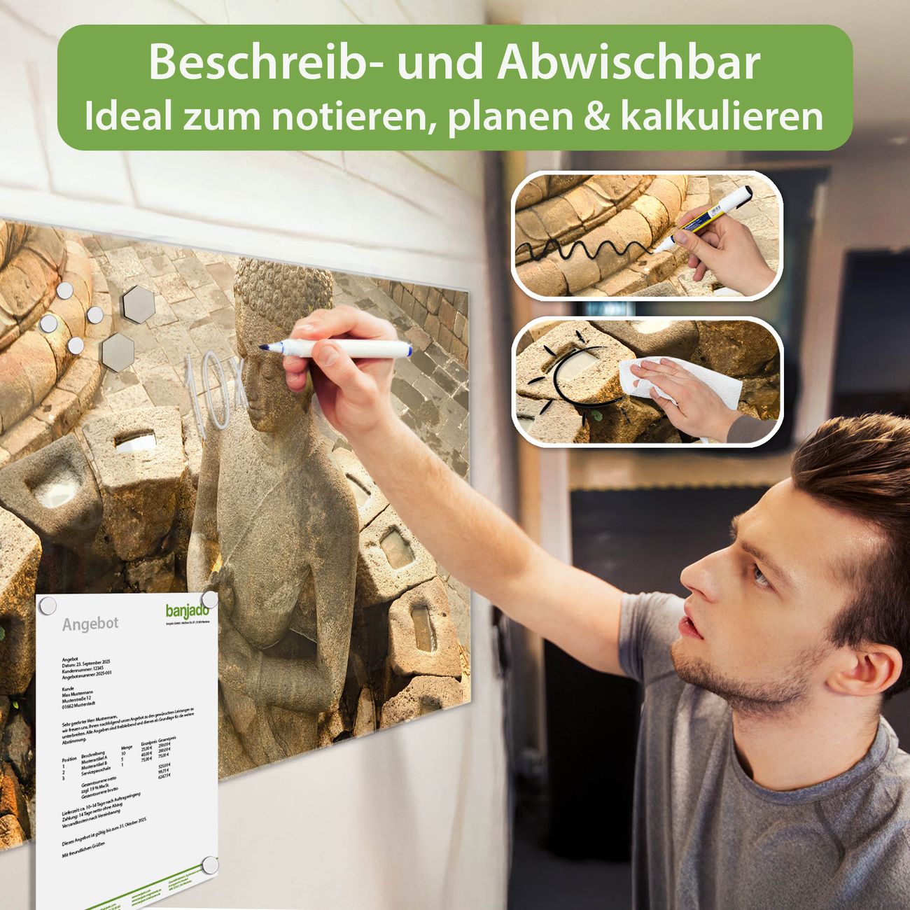 Material: 4mm Sicherheitsglas mit Metallrückwand Eigenschaften: beschreibbar, magnetisch, kratzfest Maße: 100x50x0,6cm, 7,50kg schwer Motiv Nummer 11260 Sitzender Buddha Zubehör: inklusive 4 Neodym-Magnete