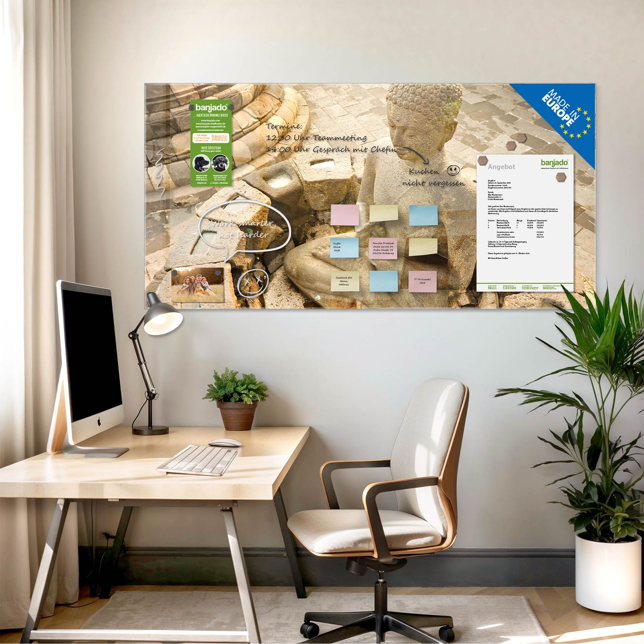 Die banjado Glas Magnettafel mit dem Motiv Motiv Sitzender Buddha verbindet Funktionalität mit Stil. Sie ersetzt das Zettelchaos durch klare Strukturen und bringt dabei eine warme, natürliche Atmosphäre in Ihr Zuhause. Ob im Büro, in der Küche oder im Eingangsbereich - dieses Design-Board zieht Blicke an und sorgt für Ordnung mit Charakter.