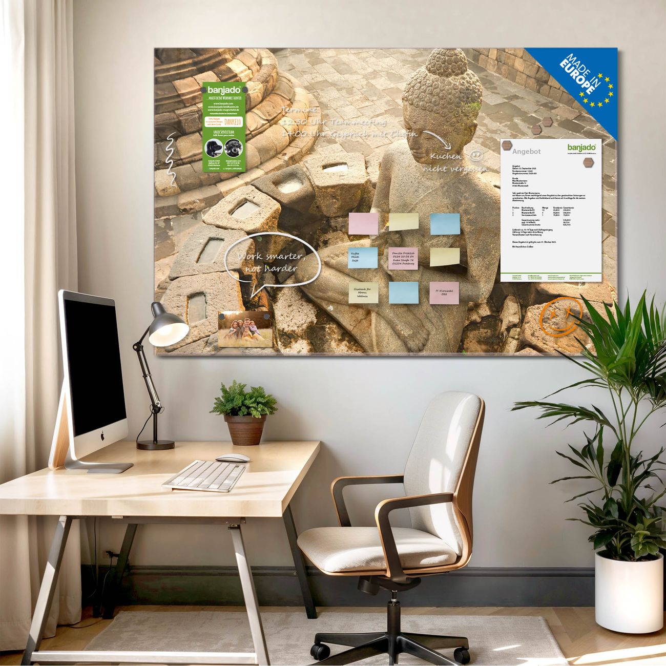 Die banjado Glas Magnettafel mit dem Motiv Motiv Sitzender Buddha verbindet Funktionalität mit Stil. Sie ersetzt das Zettelchaos durch klare Strukturen und bringt dabei eine warme, natürliche Atmosphäre in Ihr Zuhause. Ob im Büro, in der Küche oder im Eingangsbereich - dieses Design-Board zieht Blicke an und sorgt für Ordnung mit Charakter.