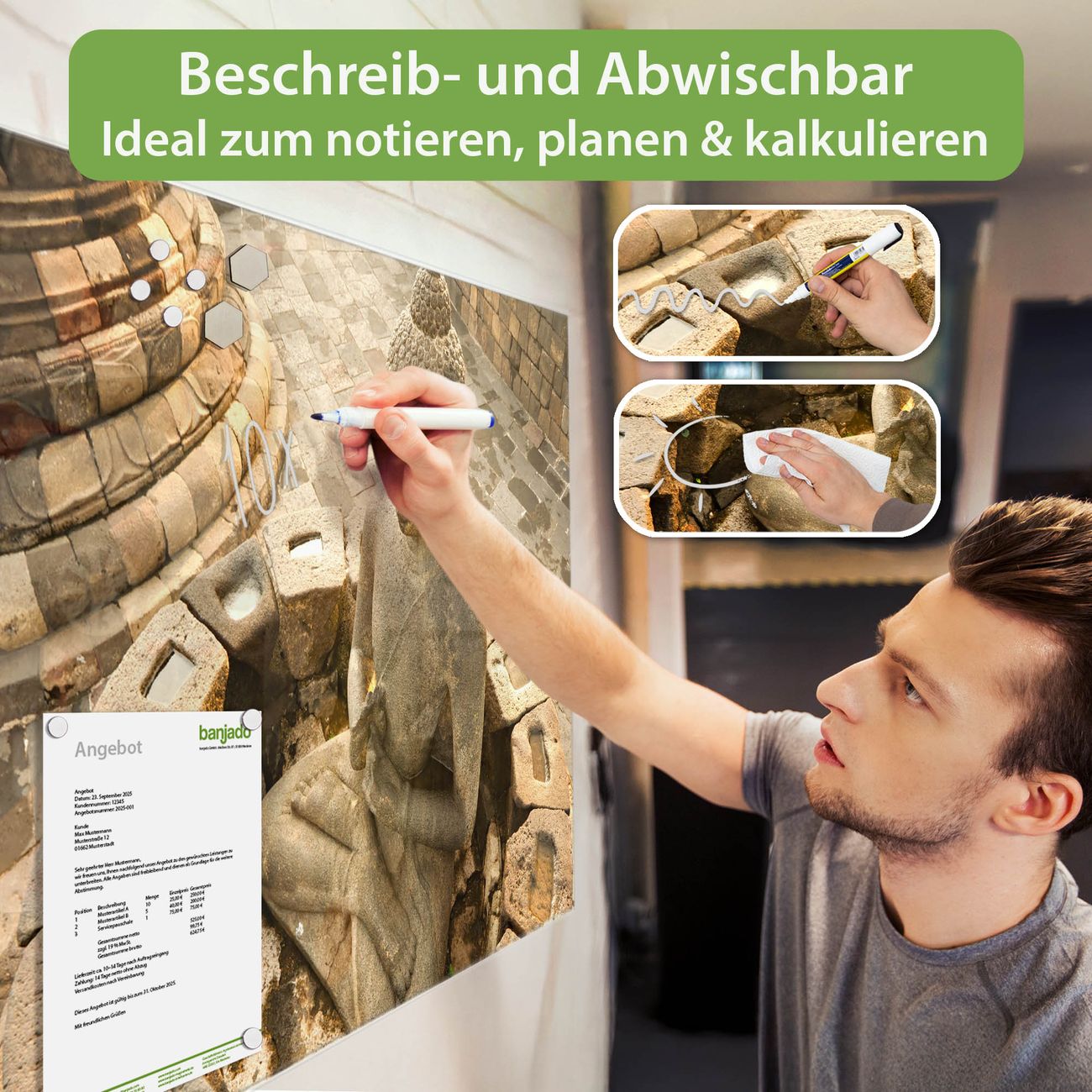 Material: 4mm Sicherheitsglas mit Metallrückwand Eigenschaften: beschreibbar, magnetisch, kratzfest Maße: 75x50x0,6cm, 5,63kg schwer Motiv Nummer 11260 Sitzender Buddha Zubehör: inklusive 4 Neodym-Magnete