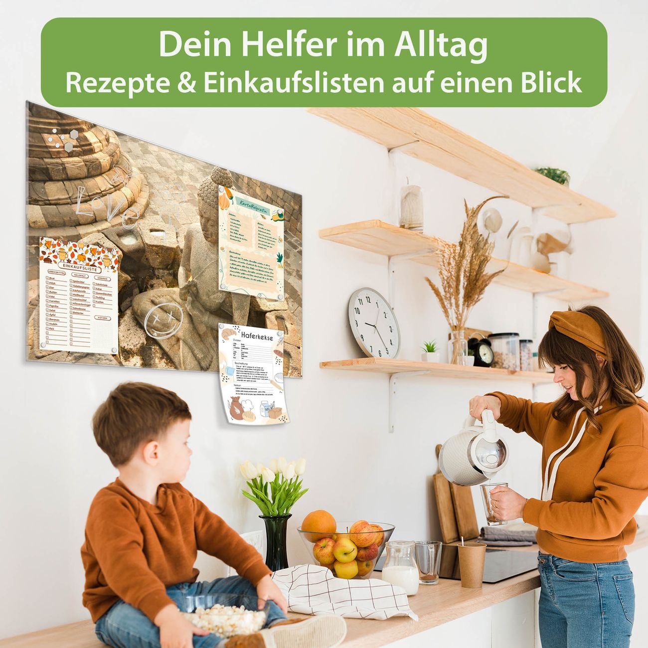 Auf der glatten Glasoberfläche lassen sich Termine, Rezepte oder Notizen ganz einfach mit Kreidestiften festhalten und rückstandslos entfernen. Starke Neodym-Magnete halten Ihre wichtigsten Erinnerungen sicher an Ort und Stelle. So entsteht Ihre ganz persönliche Ideenwand - jeden Tag neu.