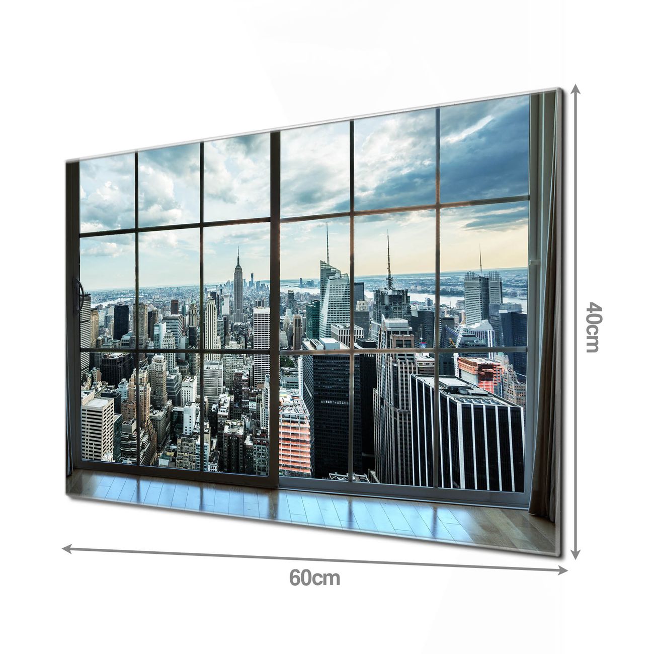 Material: 4mm Sicherheitsglas mit Metallrückwand Eigenschaften: beschreibbar, magnetisch, kratzfest Maße: 60x40x0,6cm, 3,6kg schwer Motiv Nummer 12602 Skyline Manhattan Zubehör: inklusive 4 Neodym-Magnete