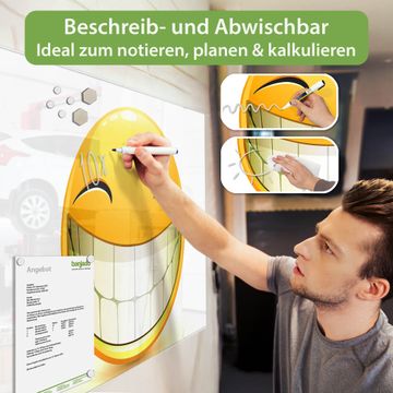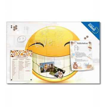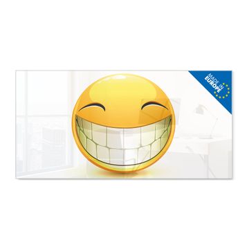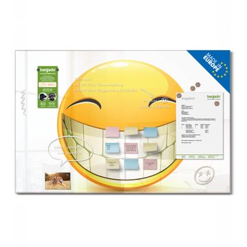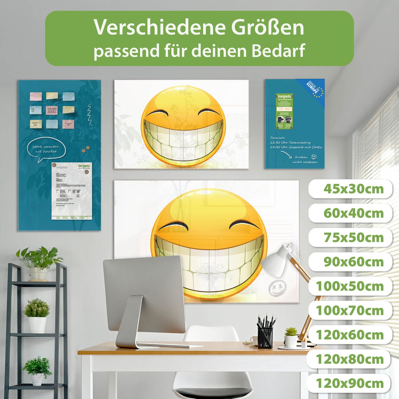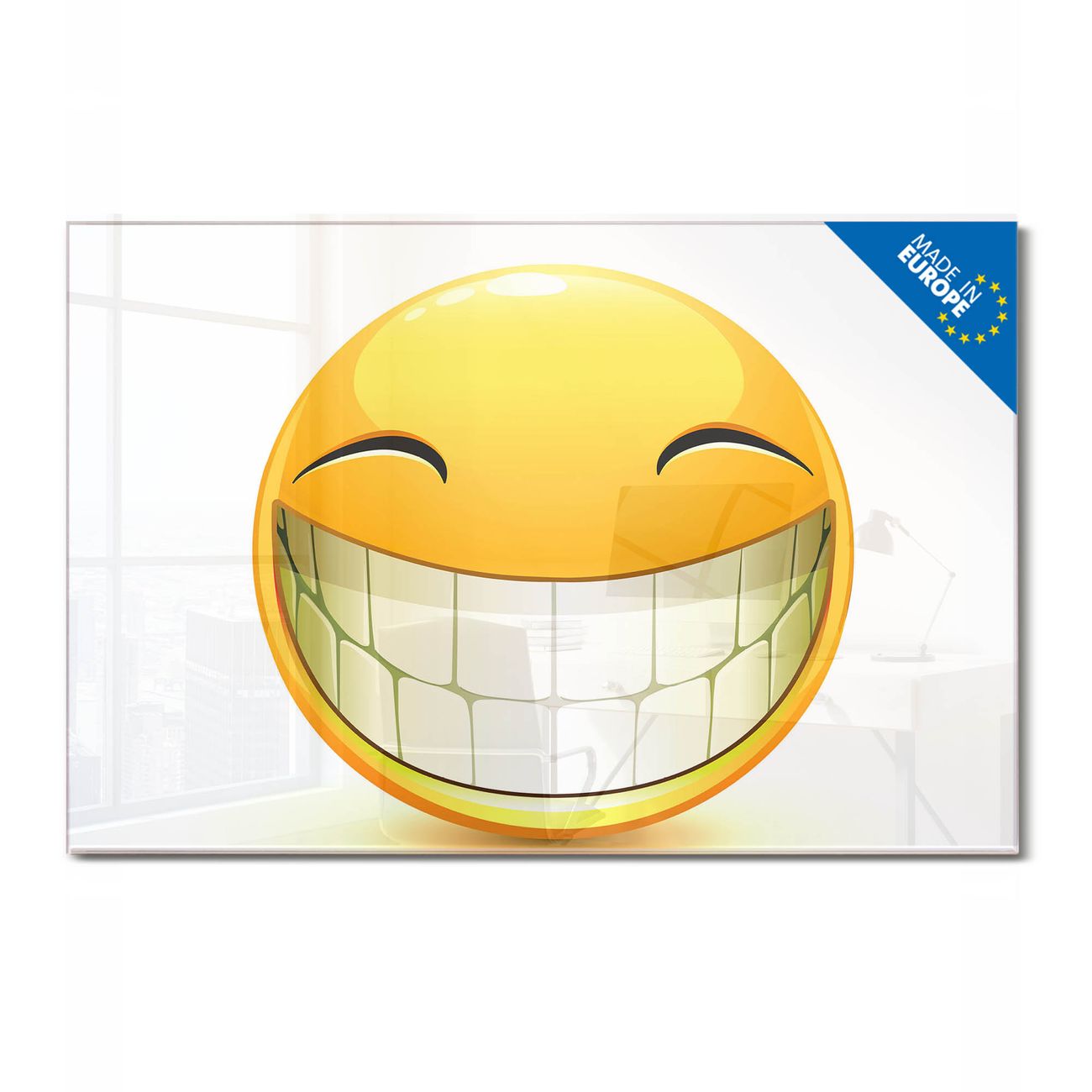 Material: 4mm Sicherheitsglas mit Metallrückwand Eigenschaften: beschreibbar, magnetisch, kratzfest Maße: 120x60x0,6cm, 10,80kg schwer Motiv Nummer 10188 Smile Zubehör: inklusive 4 Neodym-Magnete