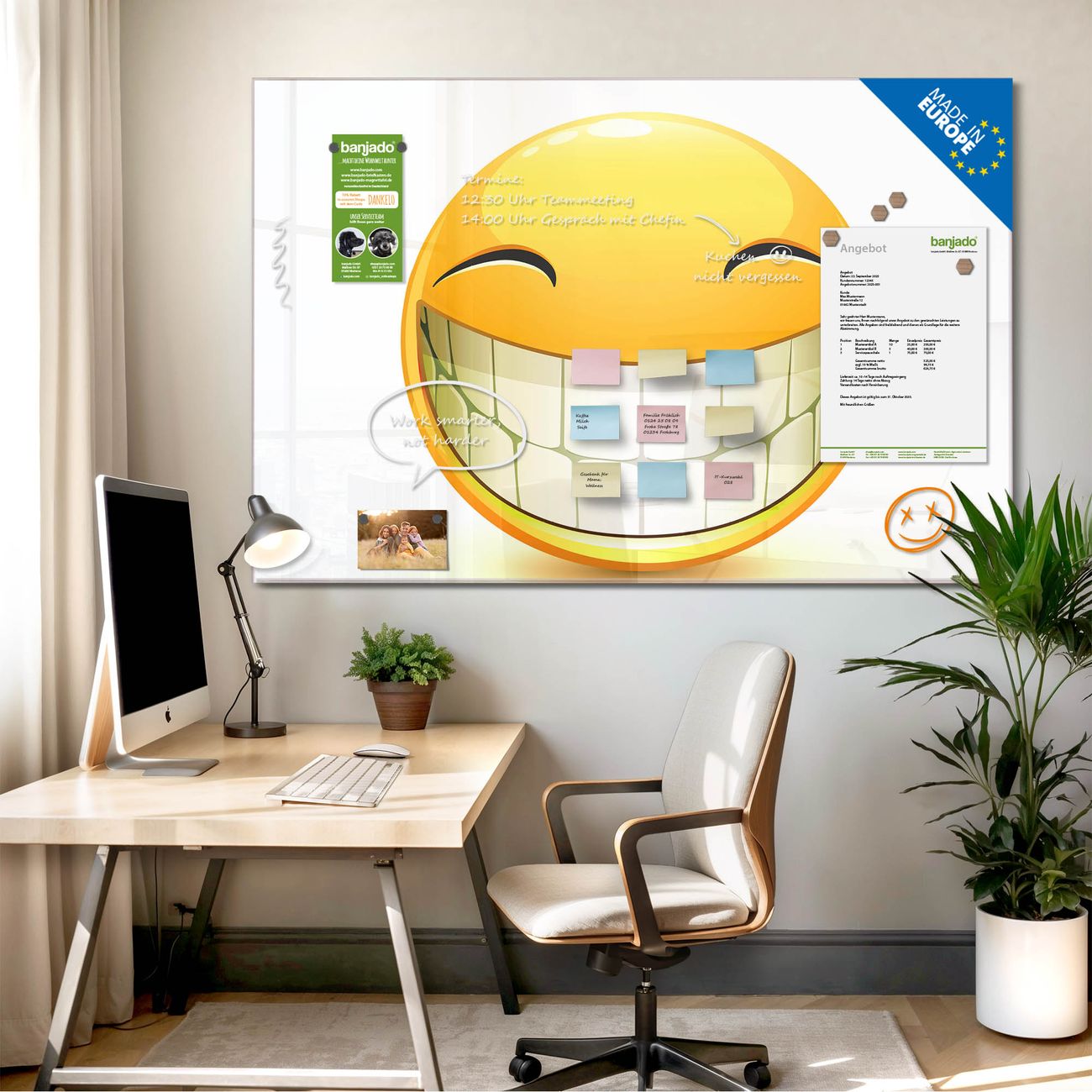 Die banjado Glas Magnettafel mit dem Motiv Motiv Smile verbindet Funktionalität mit Stil. Sie ersetzt das Zettelchaos durch klare Strukturen und bringt dabei eine warme, natürliche Atmosphäre in Ihr Zuhause. Ob im Büro, in der Küche oder im Eingangsbereich - dieses Design-Board zieht Blicke an und sorgt für Ordnung mit Charakter.