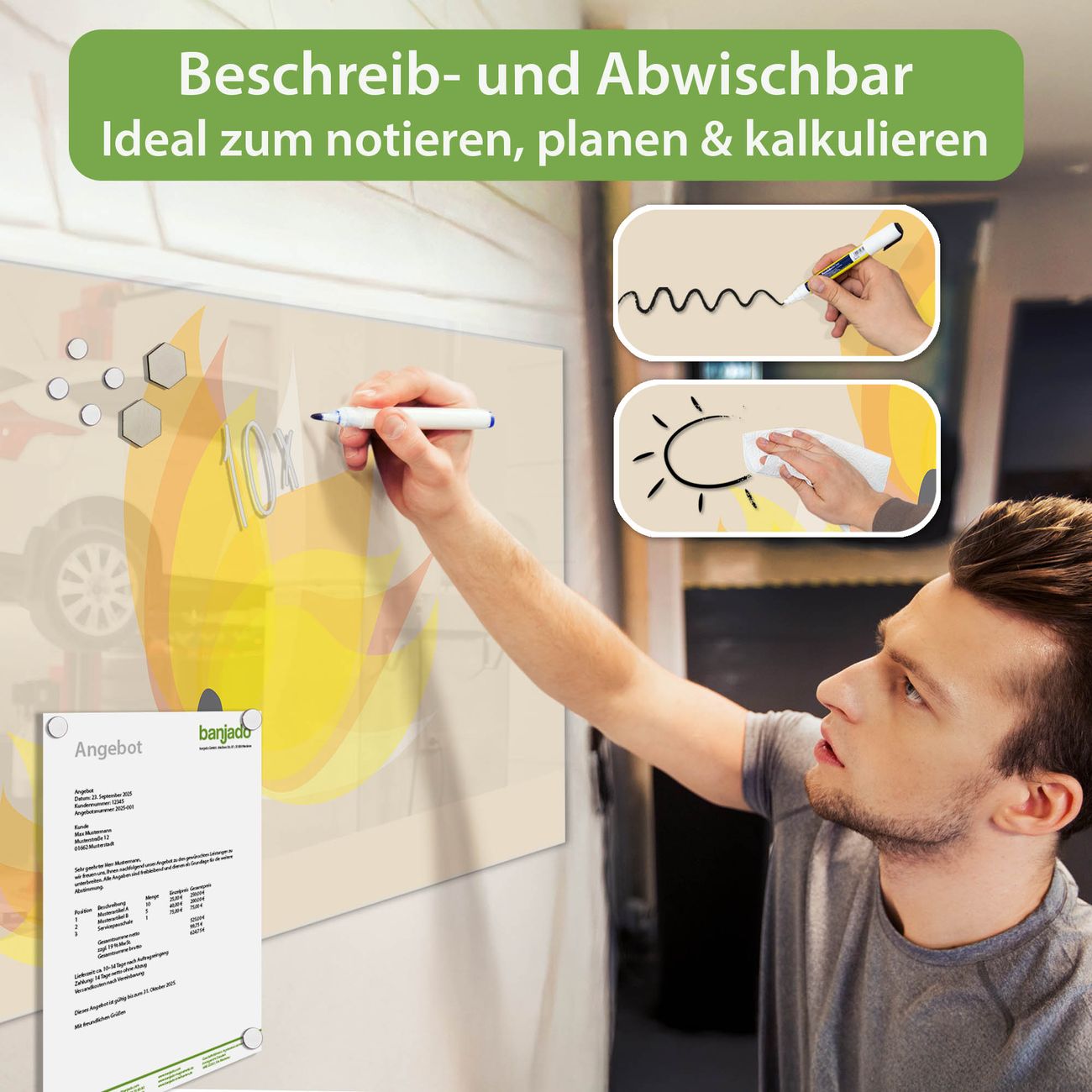 Bitte beachten Sie, dass ausschliessliche spezielle Magnete an der Glastafel haften. Wir empfehlen banjado Neodym Magnete, diese sind durch uns auf Wirksamkeit geprüft.