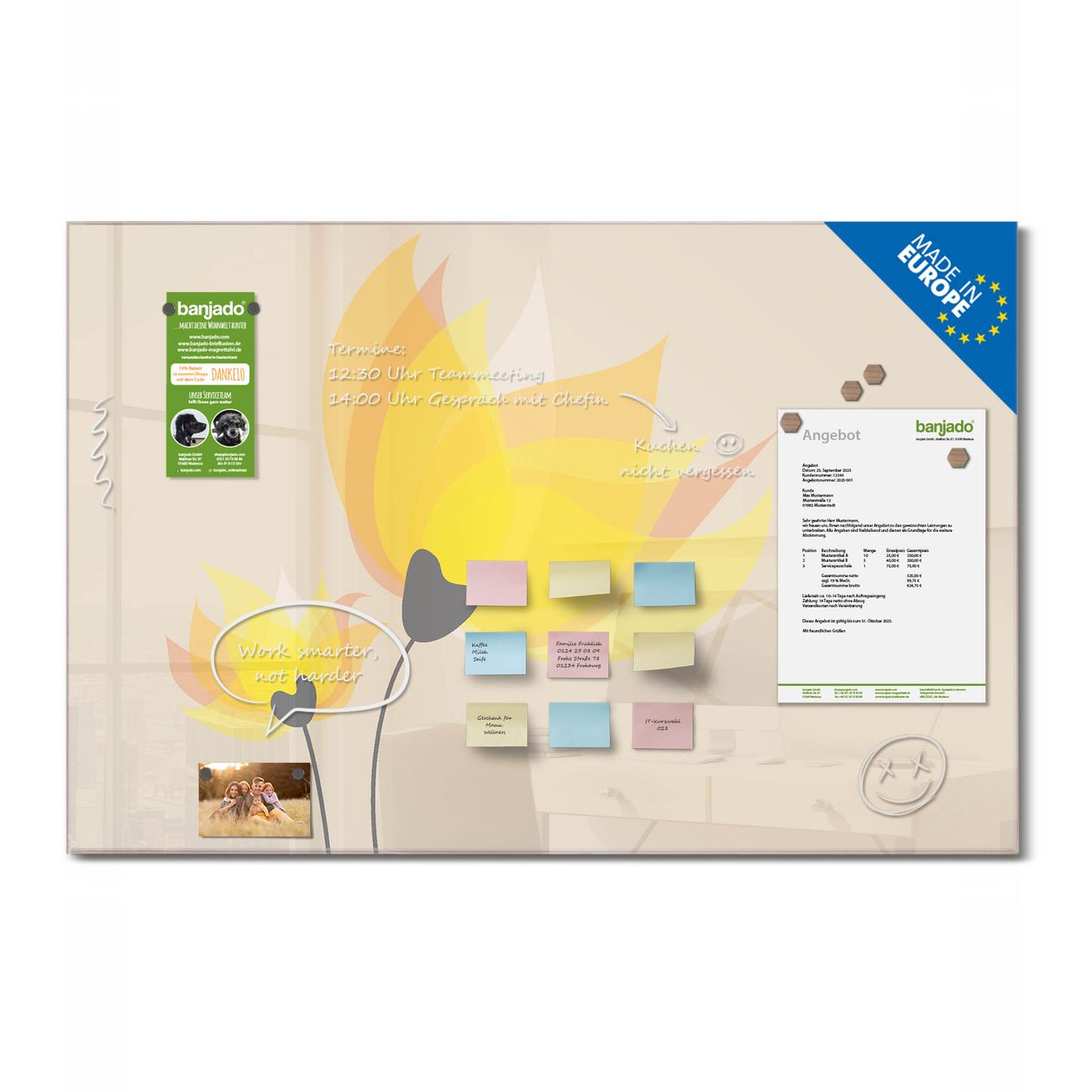 Material: 4mm Sicherheitsglas mit Metallrückwand Eigenschaften: beschreibbar, magnetisch, kratzfest Maße: 120x80x0,6cm, 14,40kg schwer Motiv Nummer 10384 Sommerblüten Zubehör: inklusive 4 Neodym-Magnete