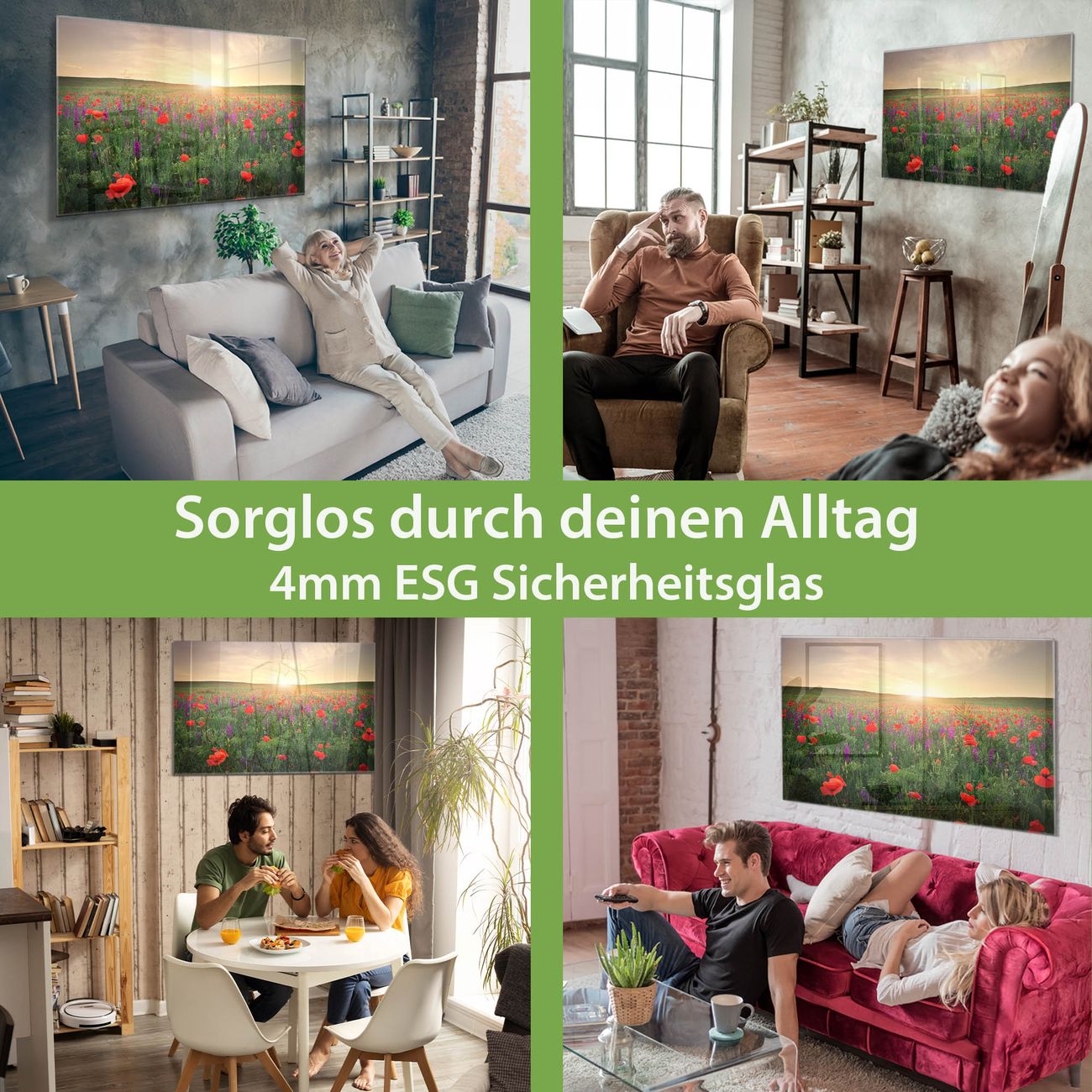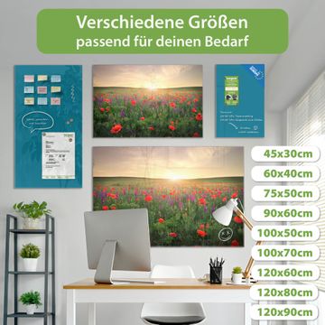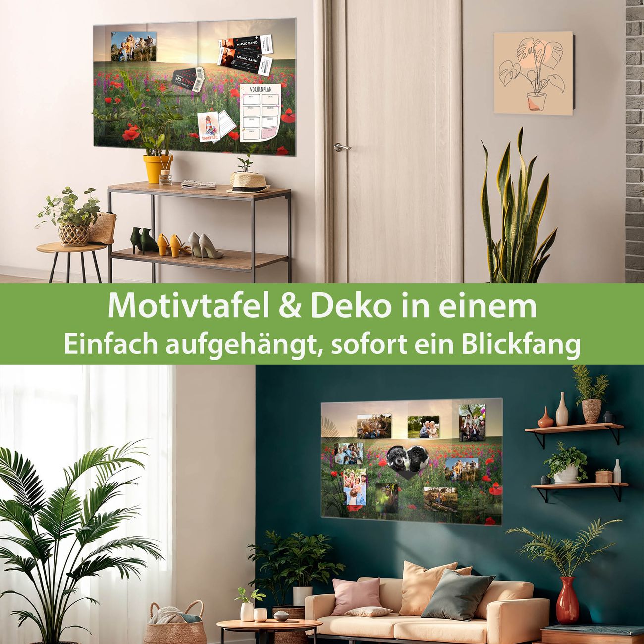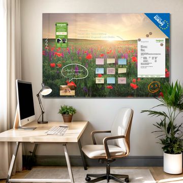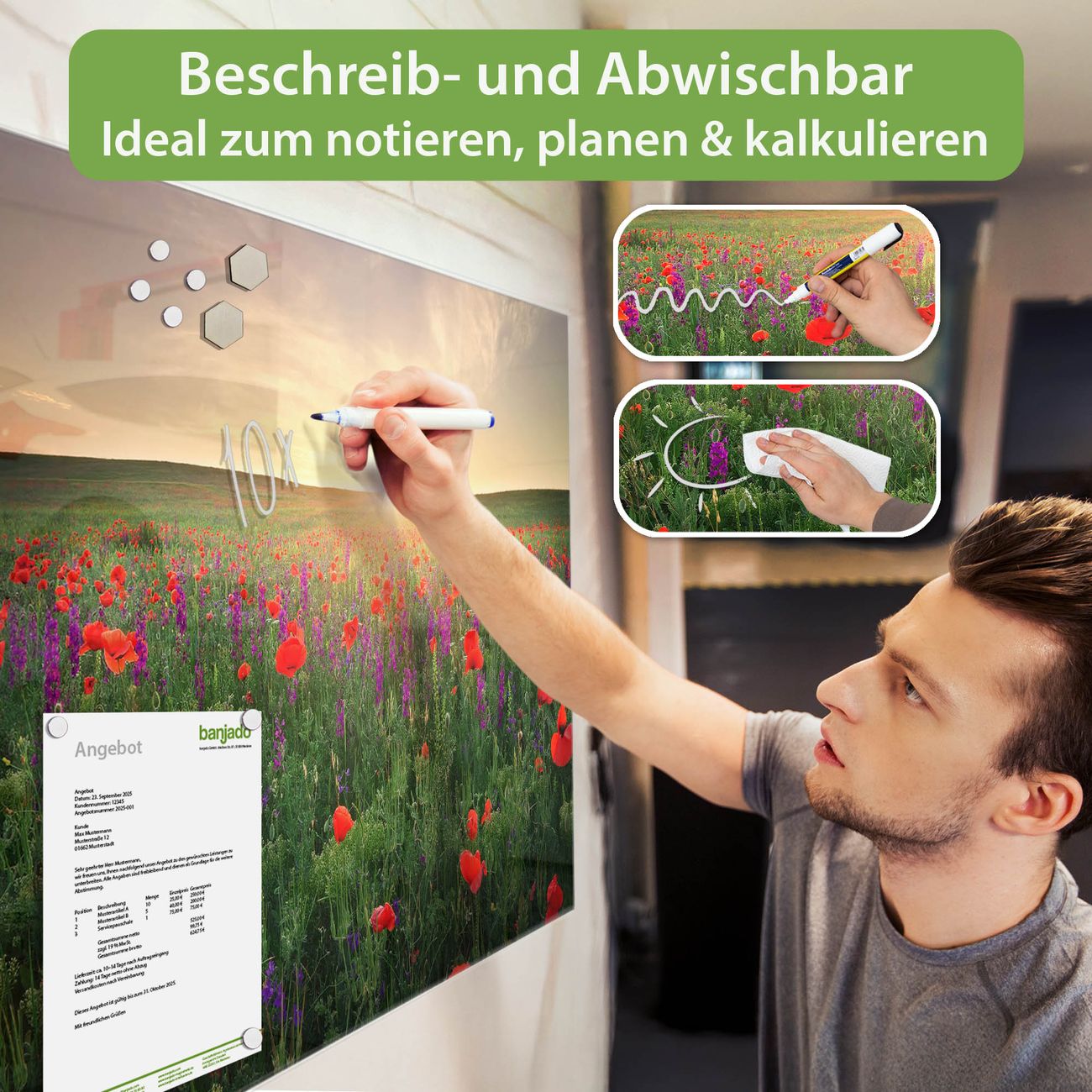 Material: 4mm Sicherheitsglas mit Metallrückwand Eigenschaften: beschreibbar, magnetisch, kratzfest Maße: 90x60x0,6cm, 8,10kg schwer Motiv Nummer 12679 Sommerfeld Zubehör: inklusive 4 Neodym-Magnete