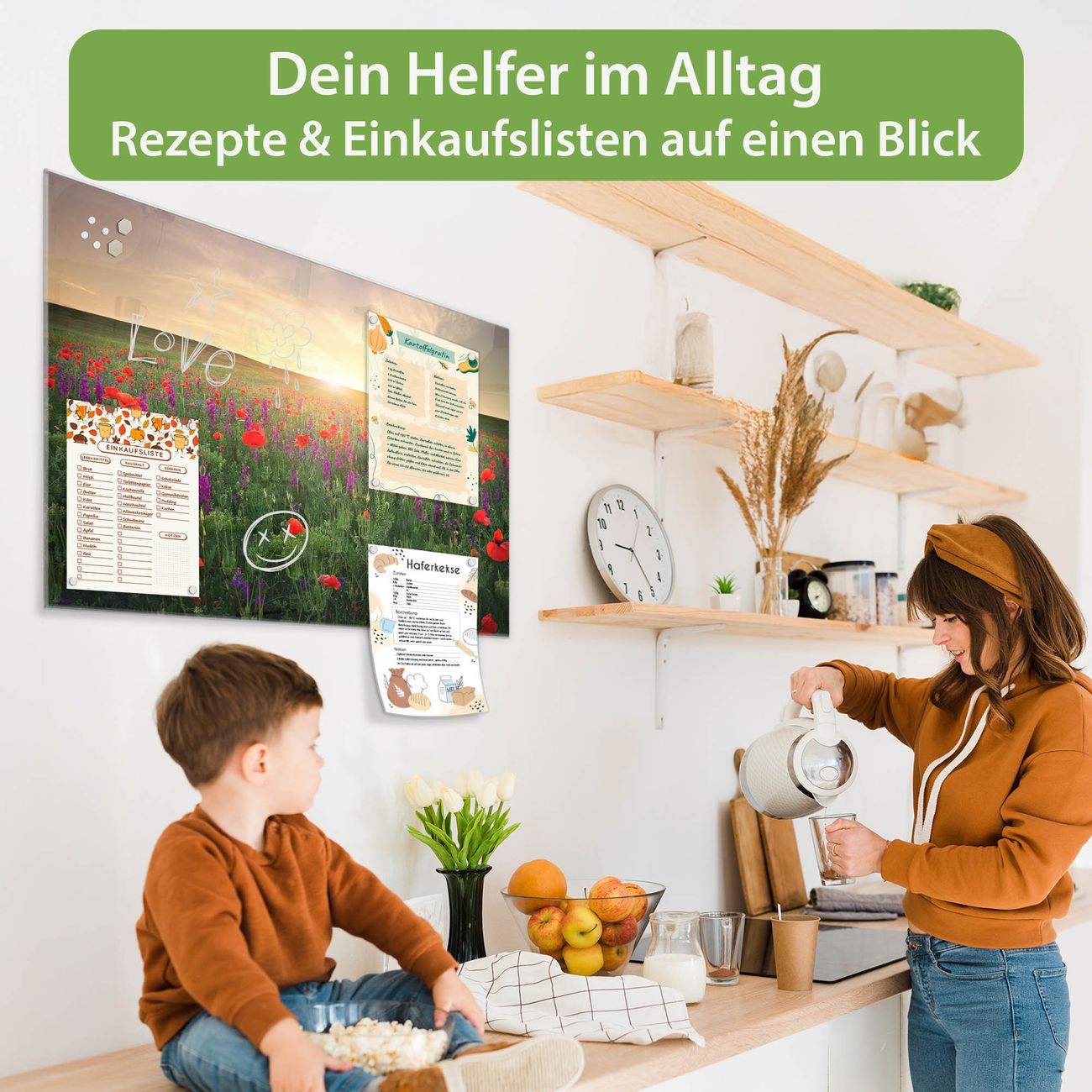 Ein Stück Design, das Ihren Alltag organisiert. Schreiben, heften, inspirieren - alles an einem Ort. Qualität, die man spürt. Montage leicht gemacht. Handwerk mit Herz - veredelt in Sachsen. Einzigartiges Design mit Motiv Motiv Sommerfeld Beschreibbare Glasoberfläche, leicht zu reinigen Starke Magnetkraft durch Stahlrückwand Inklusive 4 Neodym-Magneten Flexible Montageoptionen Handveredelt in Sachsen - Qualität, die bleibt
