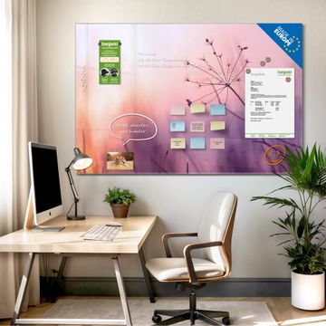 Material: 4mm Sicherheitsglas mit Metallrückwand Eigenschaften: beschreibbar, magnetisch, kratzfest Maße: 120x80x0,6cm, 14,40kg schwer Motiv Nummer 12528 Sommergras Zubehör: inklusive 4 Neodym-Magnete