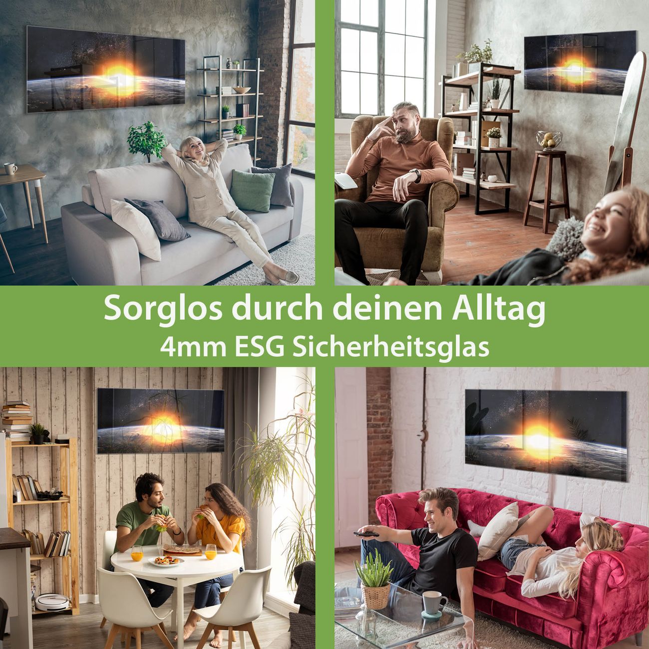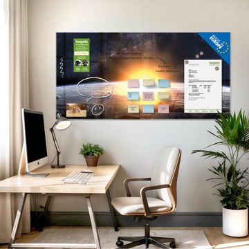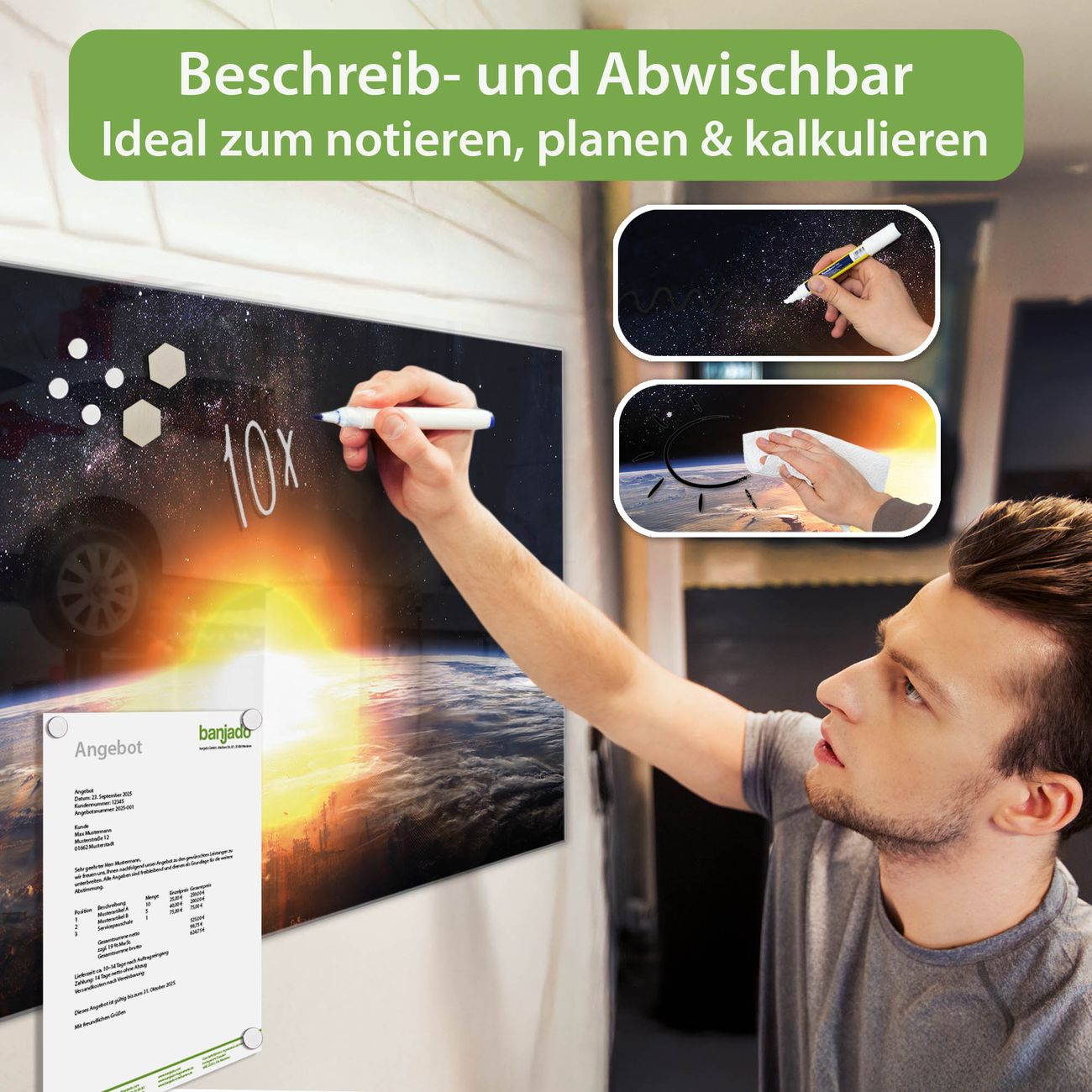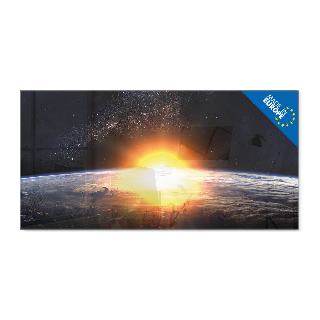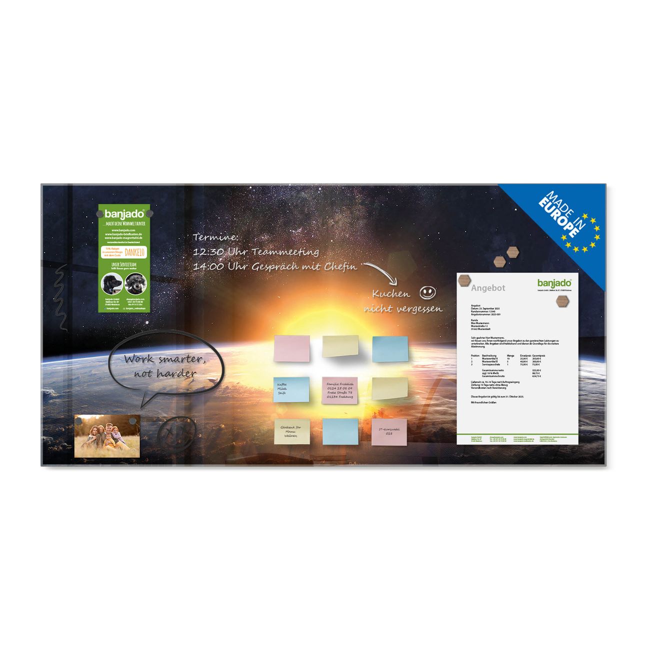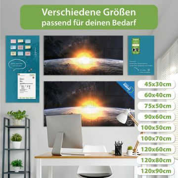 Material: 4mm Sicherheitsglas mit Metallrückwand Eigenschaften: beschreibbar, magnetisch, kratzfest Maße: 100x50x0,6cm, 7,50kg schwer Motiv Nummer 12532 Sonne im Weltall Zubehör: inklusive 4 Neodym-Magnete