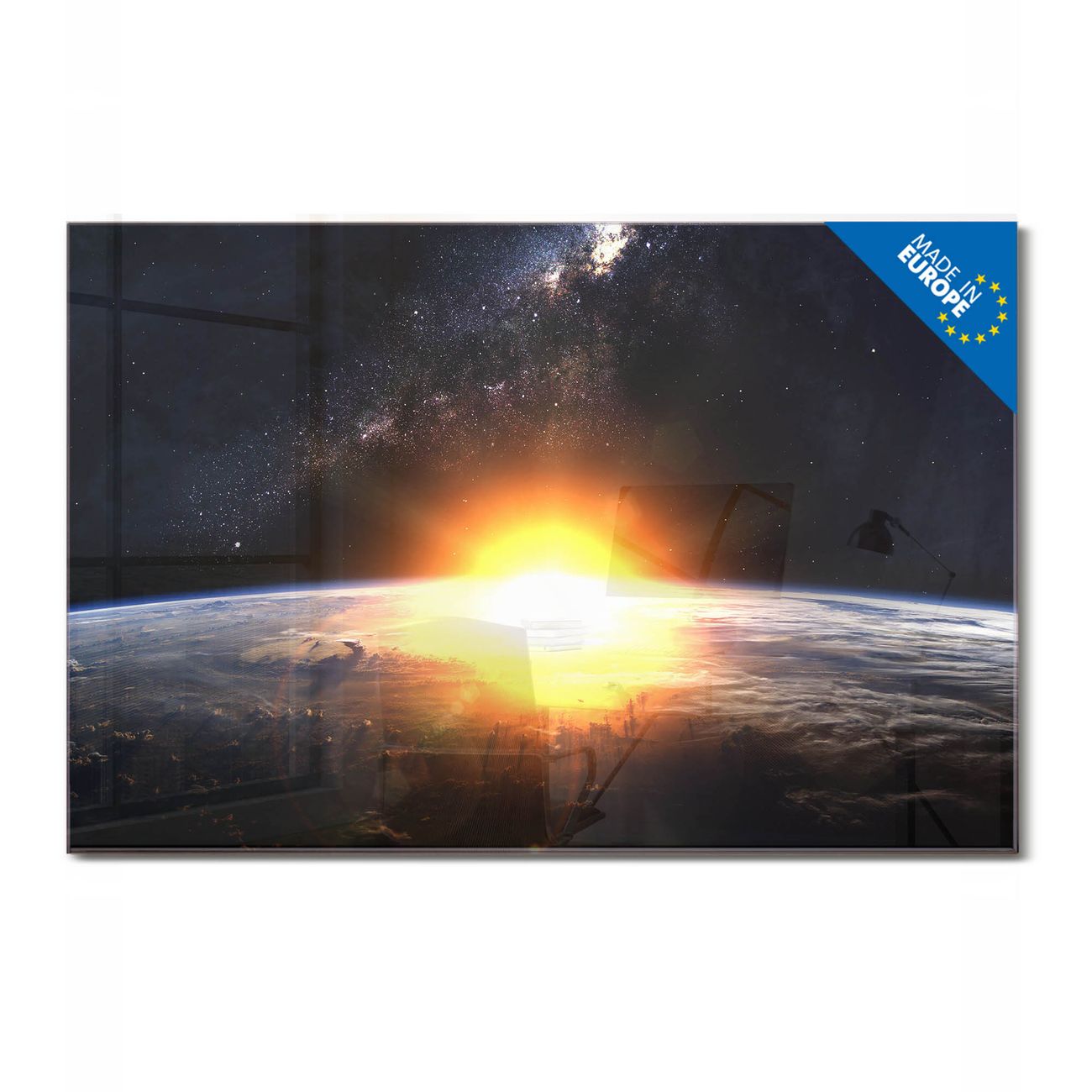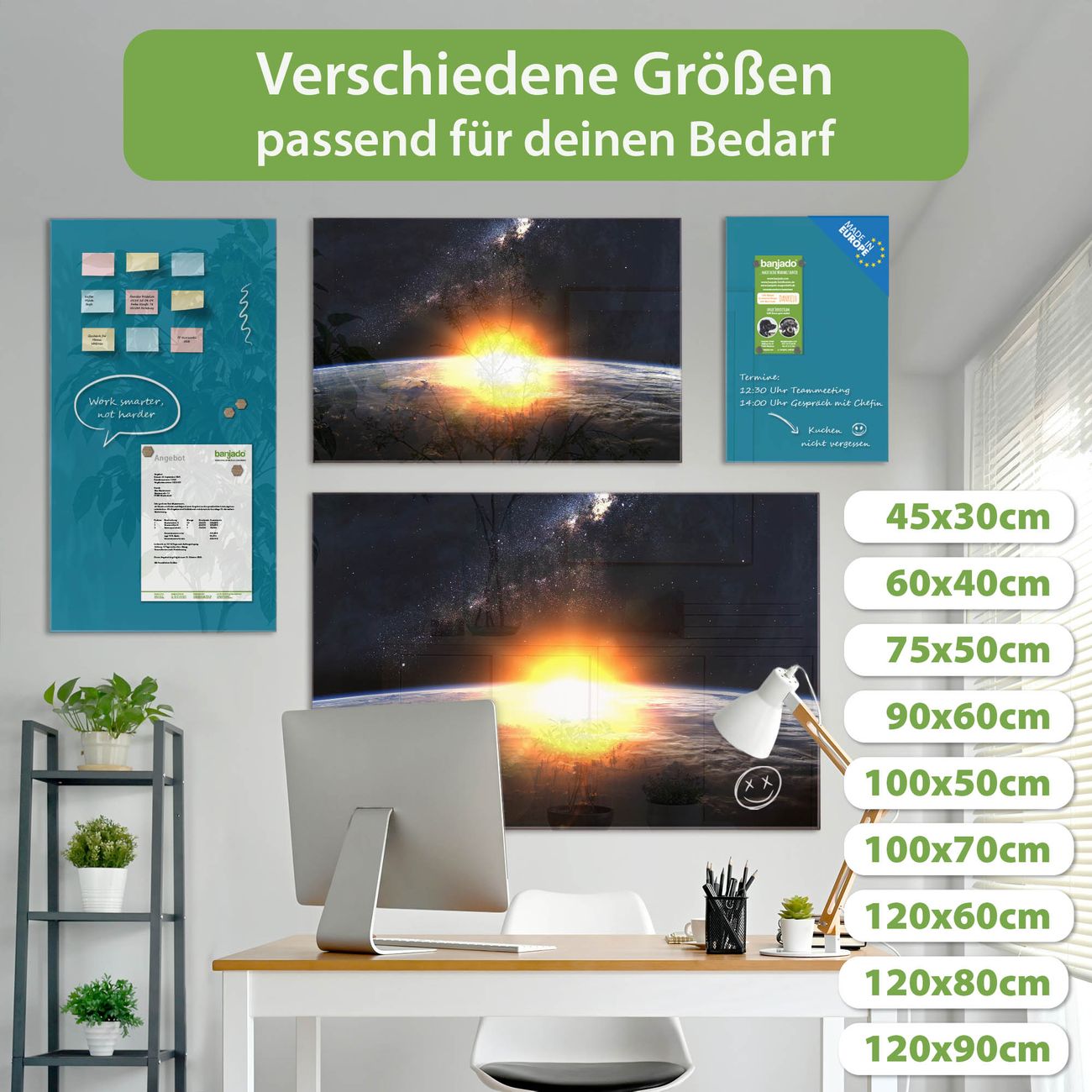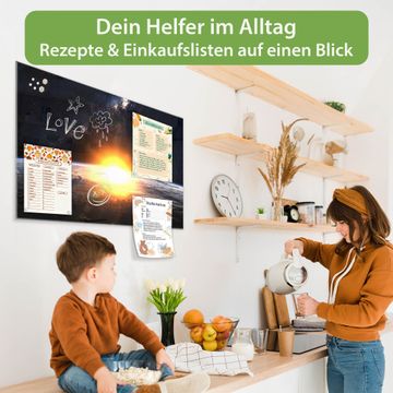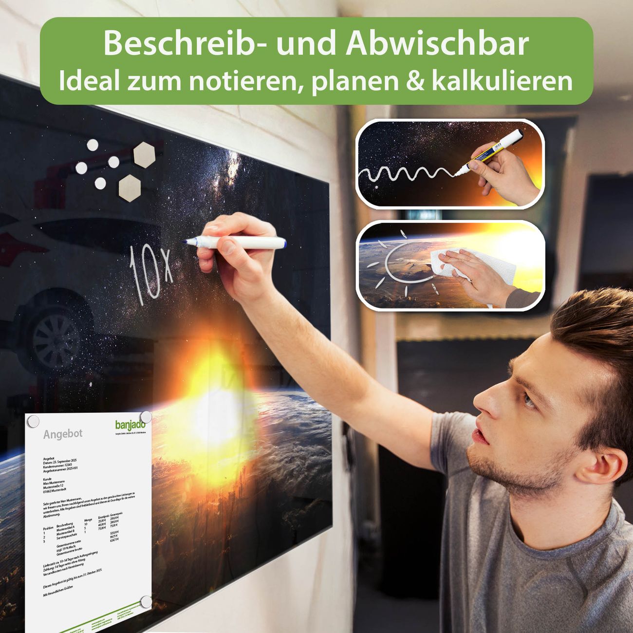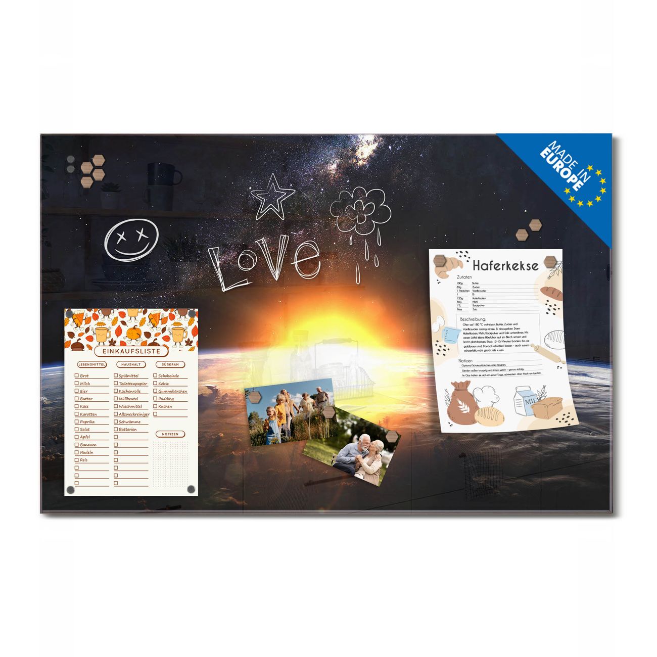 Material: 4mm Sicherheitsglas mit Metallrückwand Eigenschaften: beschreibbar, magnetisch, kratzfest Maße: 45x30x0,6cm, 2,03kg schwer Motiv Nummer 12532 Sonne im Weltall Zubehör: inklusive 4 Neodym-Magnete