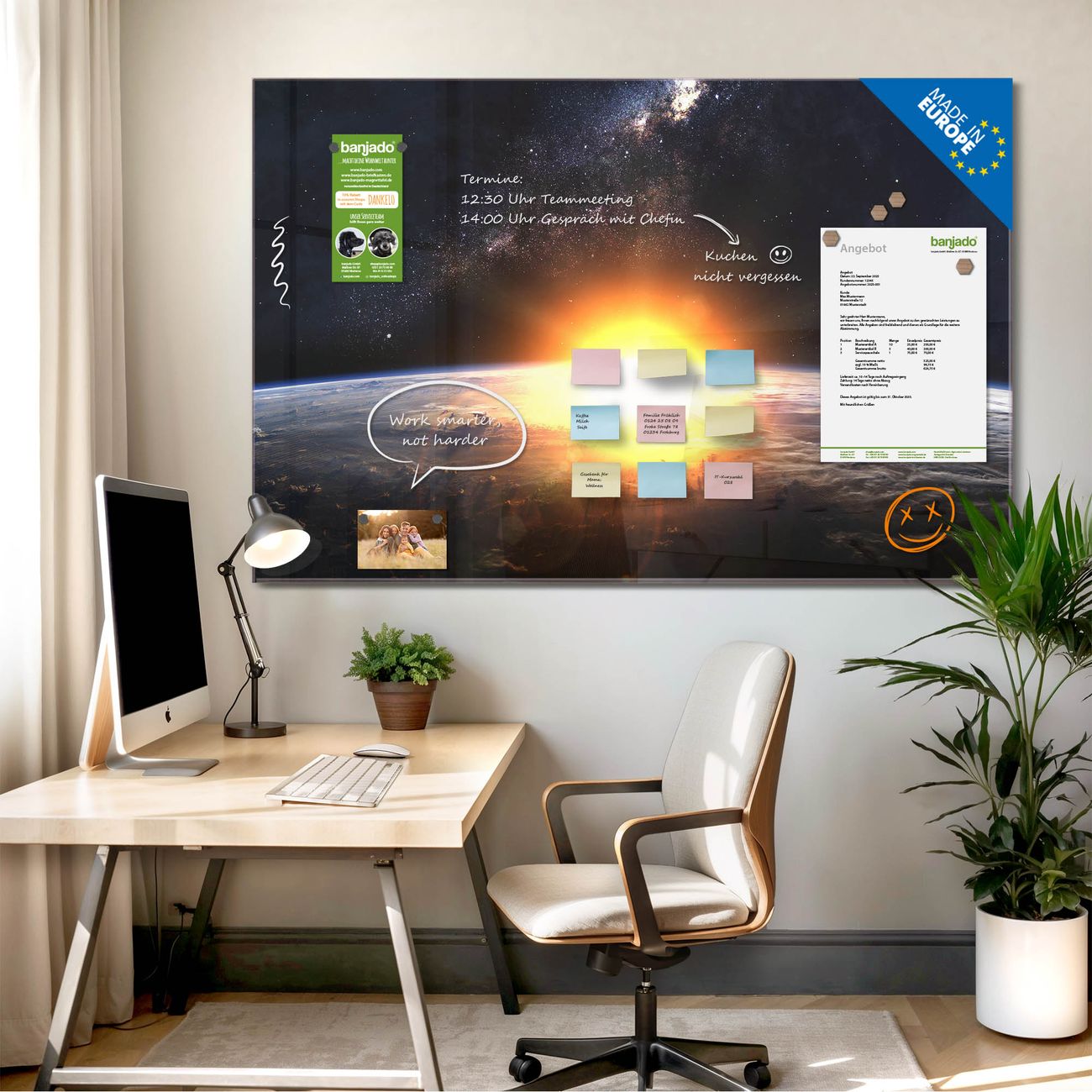 Die banjado Glas Magnettafel mit dem Motiv Motiv Sonne im Weltall verbindet Funktionalität mit Stil. Sie ersetzt das Zettelchaos durch klare Strukturen und bringt dabei eine warme, natürliche Atmosphäre in Ihr Zuhause. Ob im Büro, in der Küche oder im Eingangsbereich - dieses Design-Board zieht Blicke an und sorgt für Ordnung mit Charakter.