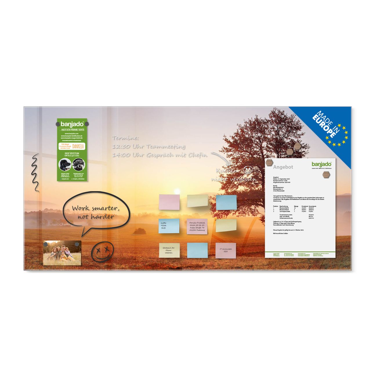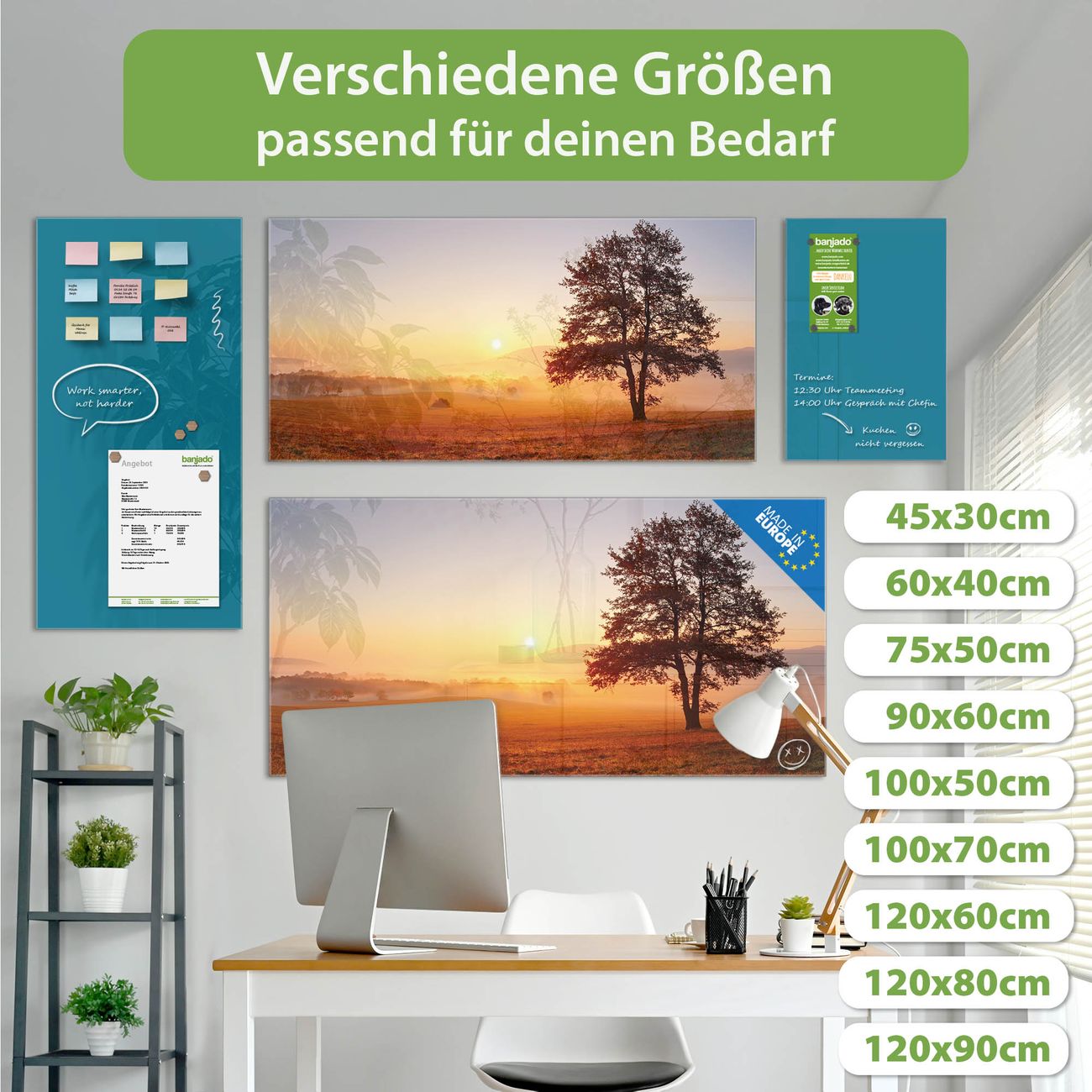 Jede Glas Magnettafel wird in unserer Werkstatt von Hand gefertigt und sorgfältig geprüft. So erhalten Sie ein echtes Qualitätsprodukt, das Funktion und Ästhetik perfekt vereint.?? Warum banjado?