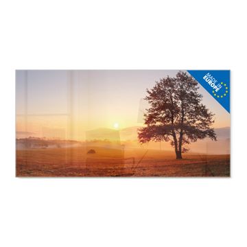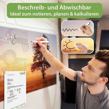 Material: 4mm Sicherheitsglas mit Metallrückwand Eigenschaften: beschreibbar, magnetisch, kratzfest Maße: 120x60x0,6cm, 10,80kg schwer Motiv Nummer 12297 Sonnenaufgang Zubehör: inklusive 4 Neodym-Magnete
