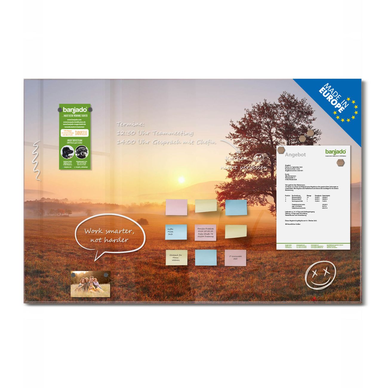Die banjado Glas Magnettafel mit dem Motiv Motiv Sonnenaufgang verbindet Funktionalität mit Stil. Sie ersetzt das Zettelchaos durch klare Strukturen und bringt dabei eine warme, natürliche Atmosphäre in Ihr Zuhause. Ob im Büro, in der Küche oder im Eingangsbereich - dieses Design-Board zieht Blicke an und sorgt für Ordnung mit Charakter.