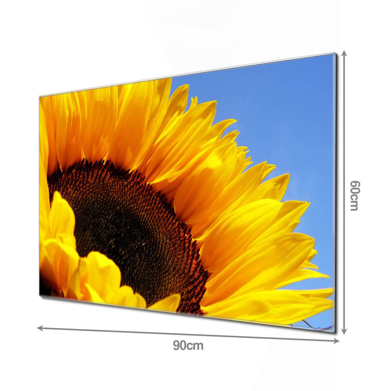 Material: 4mm Sicherheitsglas mit Metallrückwand Eigenschaften: beschreibbar, magnetisch, kratzfest Maße: 90x60x0,6cm, 8,10kg schwer Motiv Nummer 10109 Sonnenblume Zubehör: inklusive 4 Neodym-Magnete