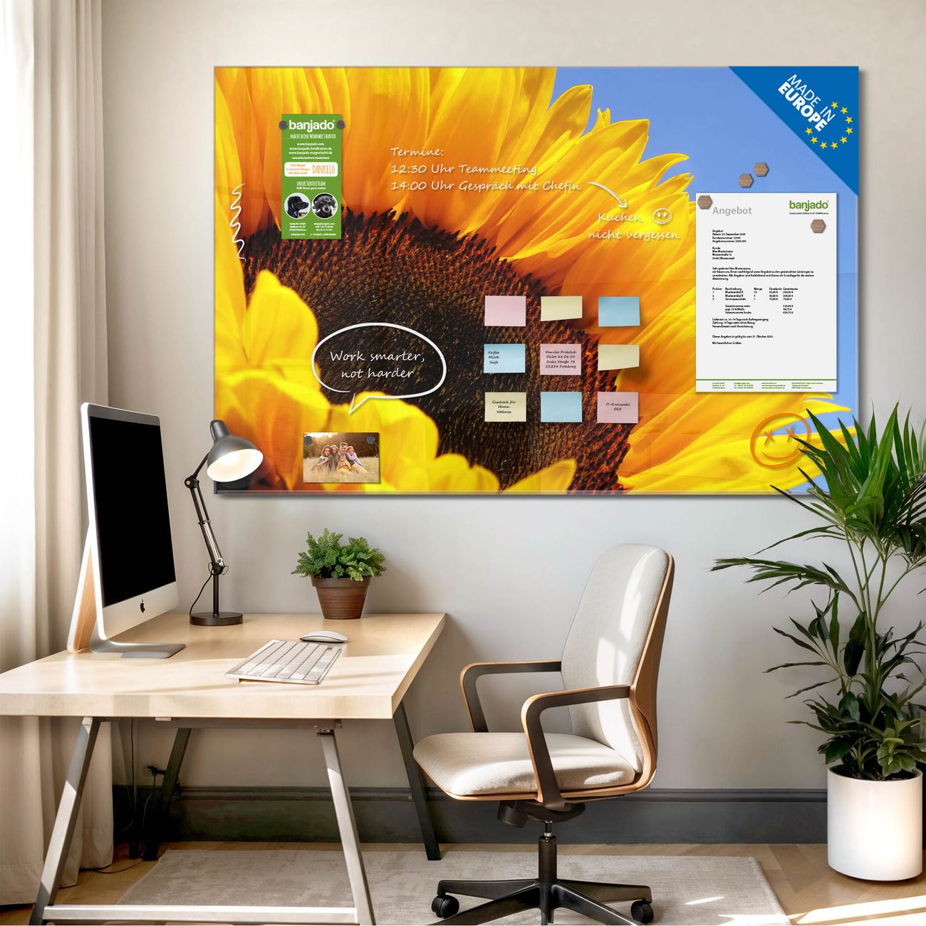 Jede Glas Magnettafel wird in unserer Werkstatt von Hand gefertigt und sorgfältig geprüft. So erhalten Sie ein echtes Qualitätsprodukt, das Funktion und Ästhetik perfekt vereint.?? Warum banjado?
