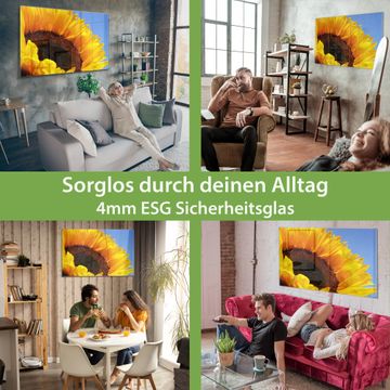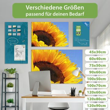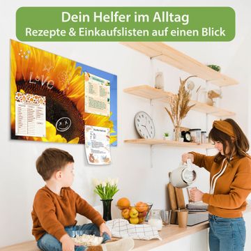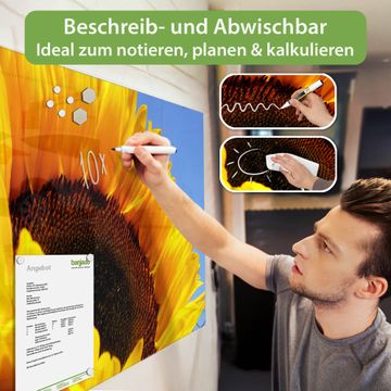 Material: 4mm Sicherheitsglas mit Metallrückwand Eigenschaften: beschreibbar, magnetisch, kratzfest Maße: 45x30x0,6cm, 2,03kg schwer Motiv Nummer 10109 Sonnenblume Zubehör: inklusive 4 Neodym-Magnete