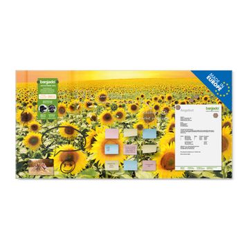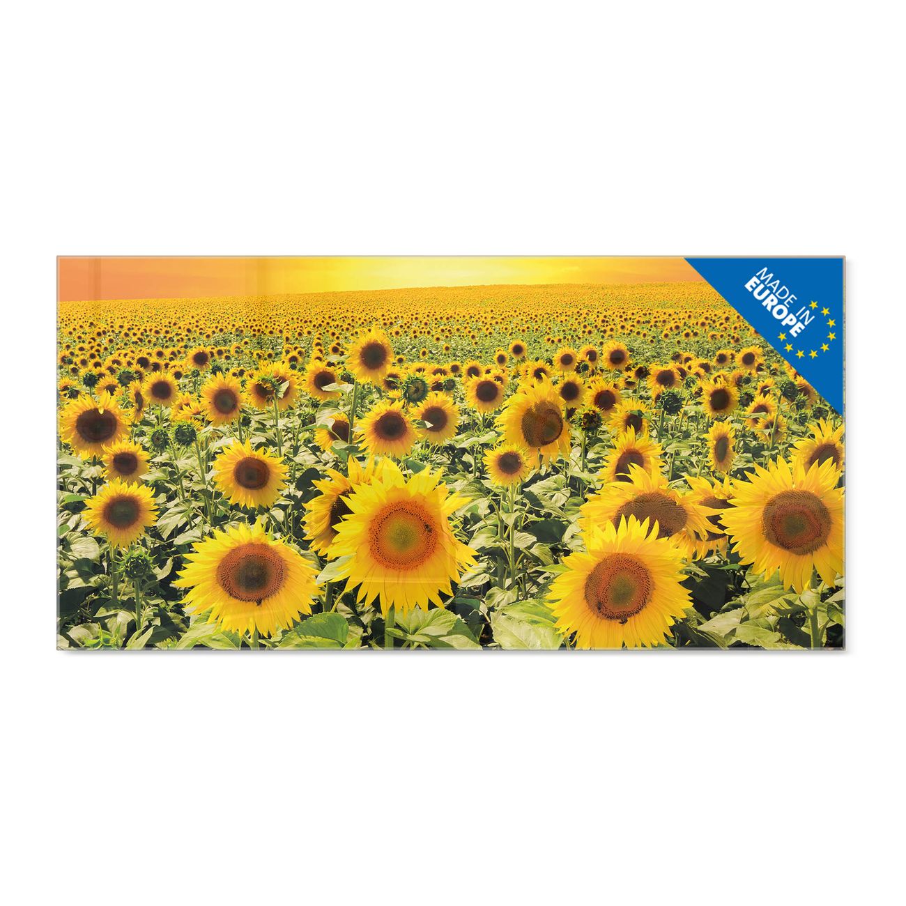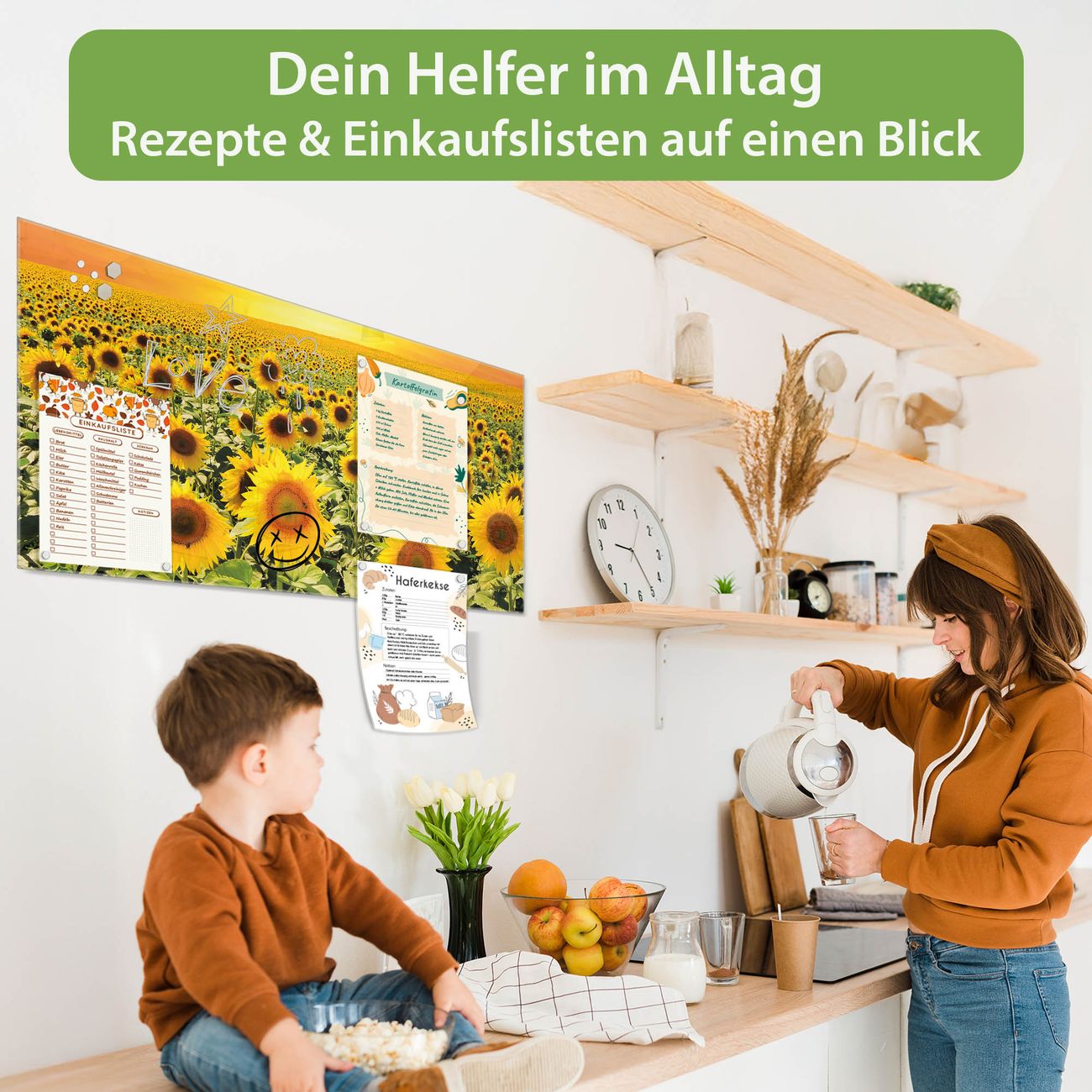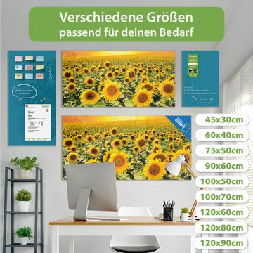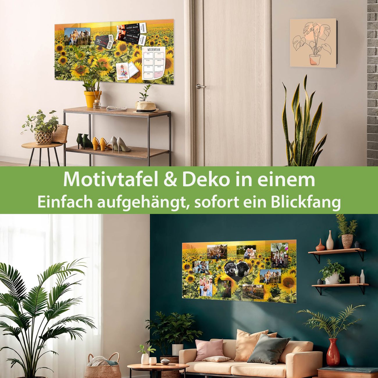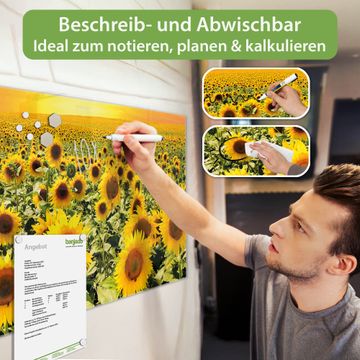 Material: 4mm Sicherheitsglas mit Metallrückwand Eigenschaften: beschreibbar, magnetisch, kratzfest Maße: 120x60x0,6cm, 10,80kg schwer Motiv Nummer 12283 Sonnenblumenmeer Zubehör: inklusive 4 Neodym-Magnete