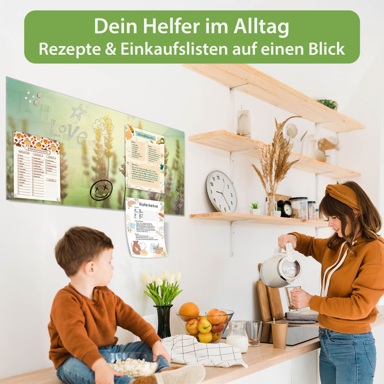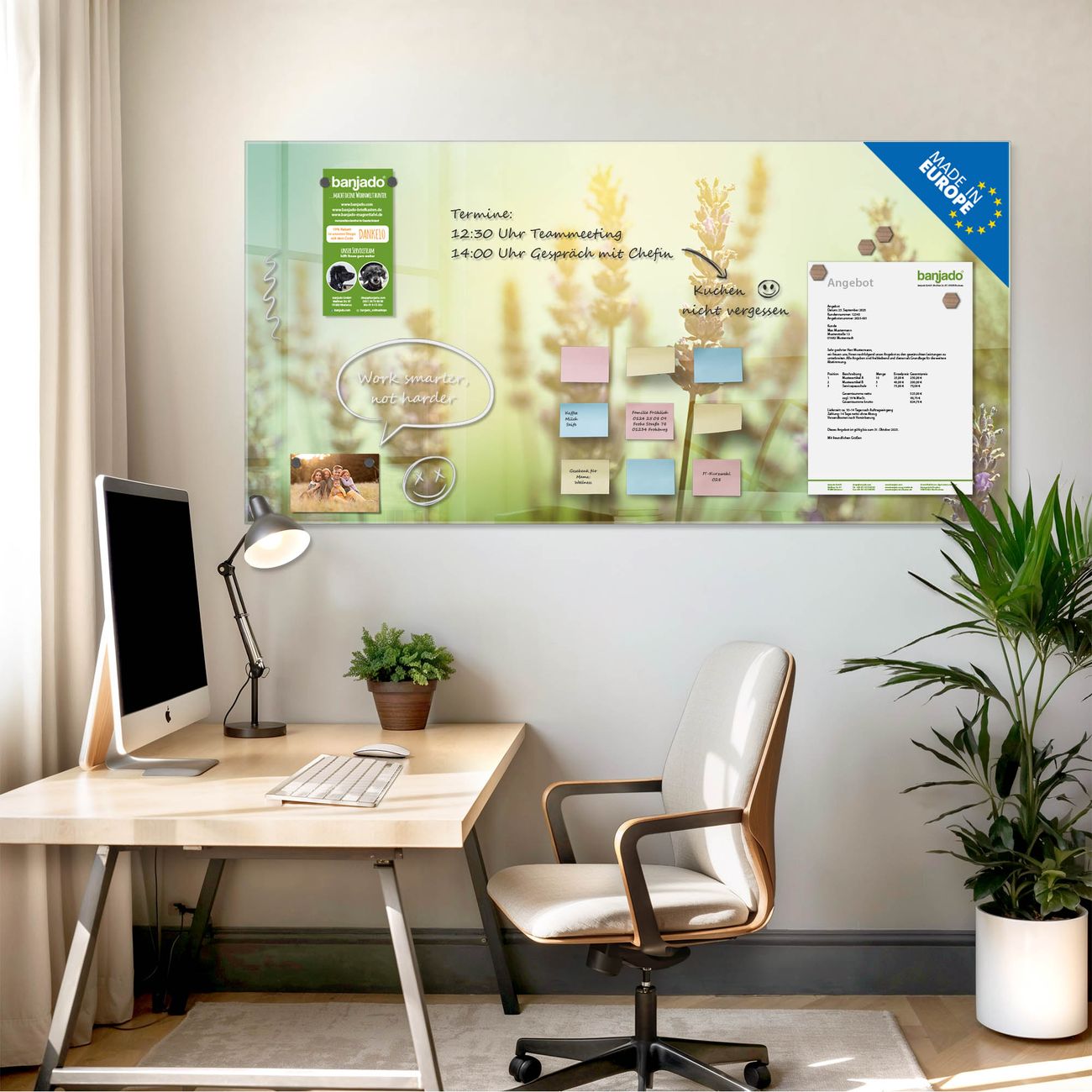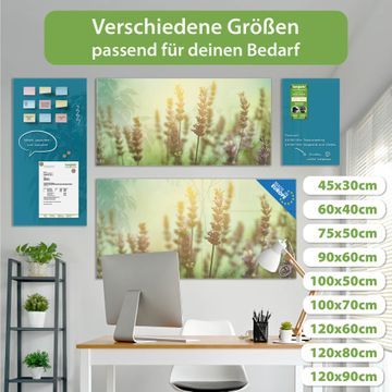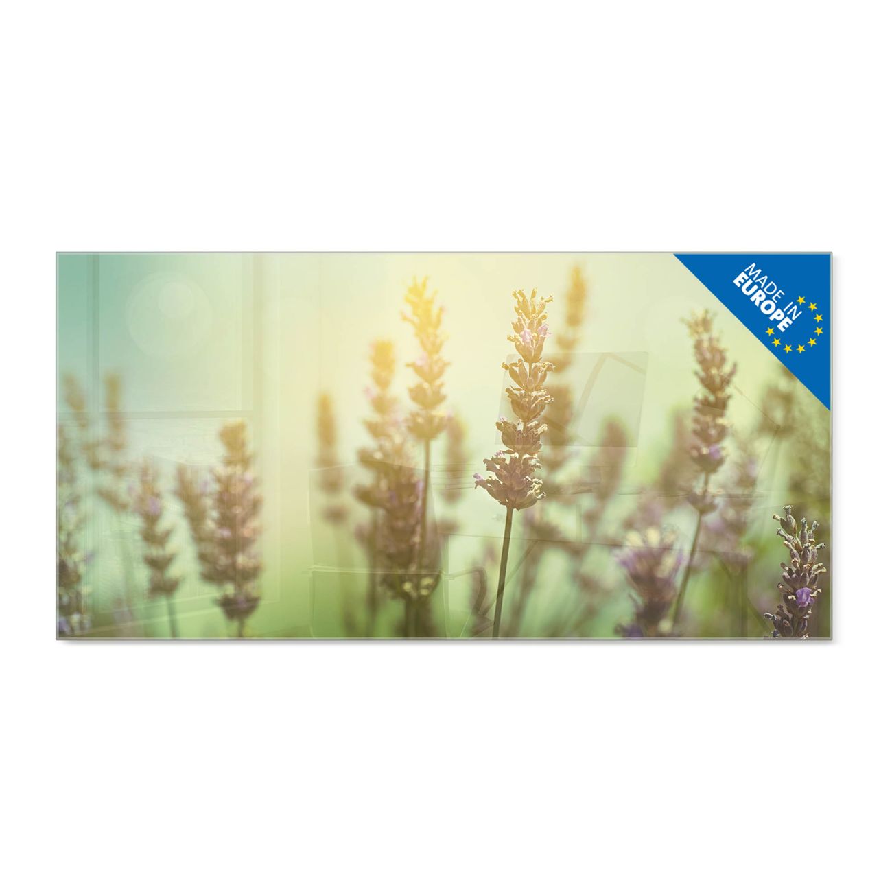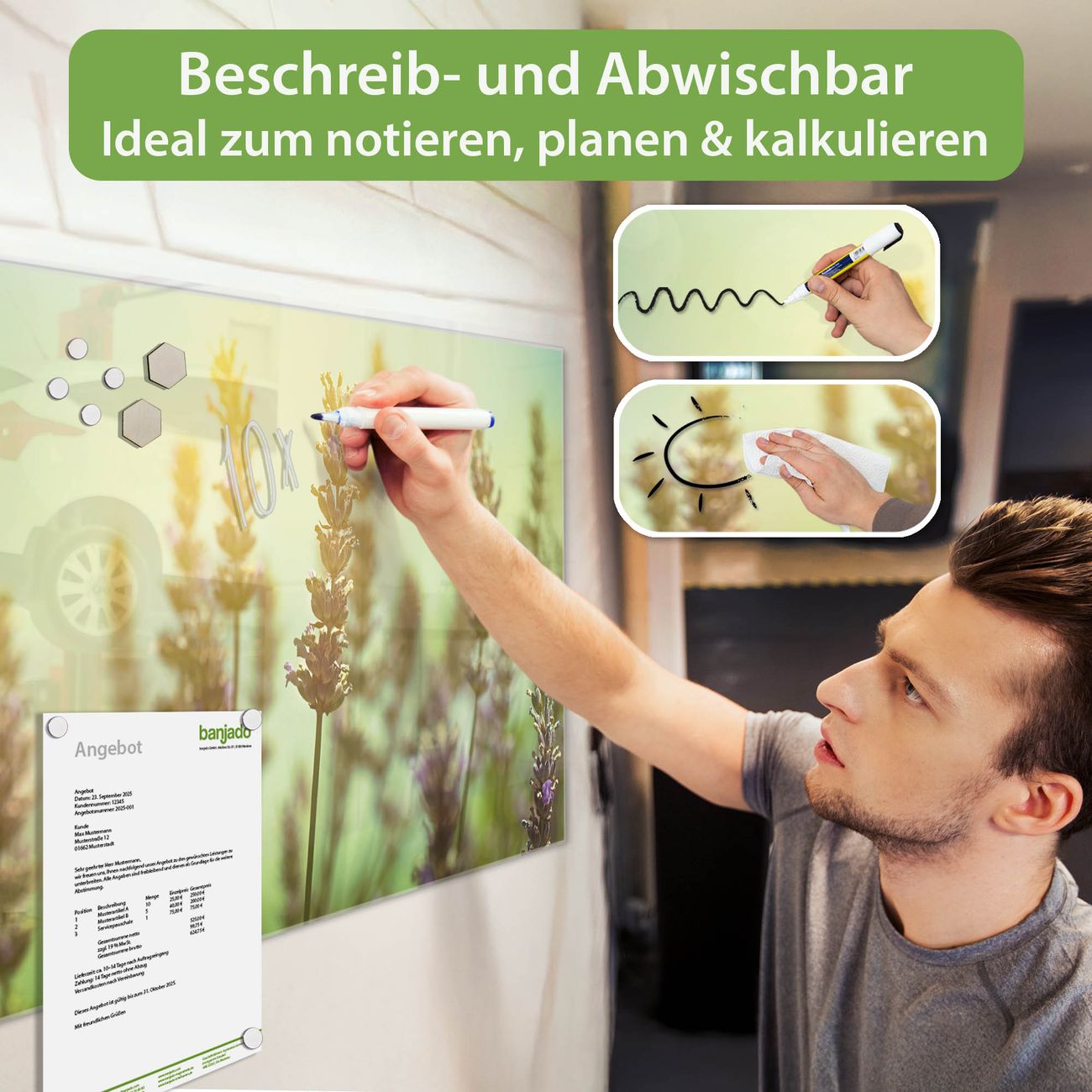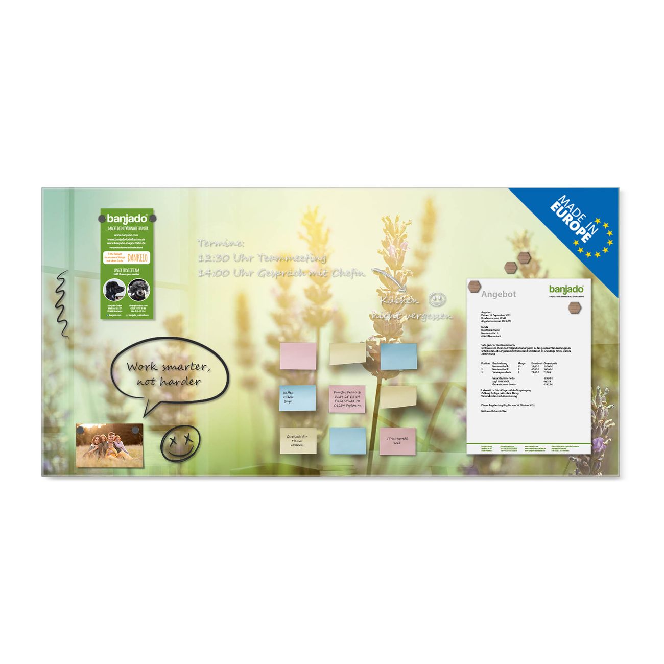 Material: 4mm Sicherheitsglas mit Metallrückwand Eigenschaften: beschreibbar, magnetisch, kratzfest Maße: 100x50x0,6cm, 7,50kg schwer Motiv Nummer 11622 Sonnenlavendel Zubehör: inklusive 4 Neodym-Magnete