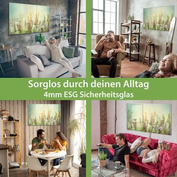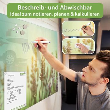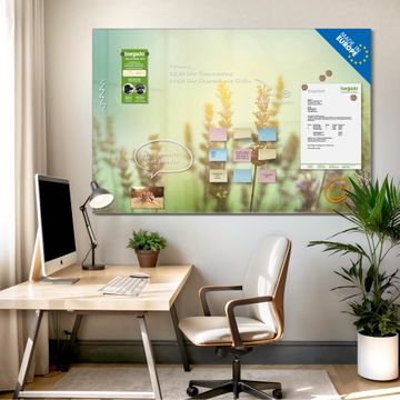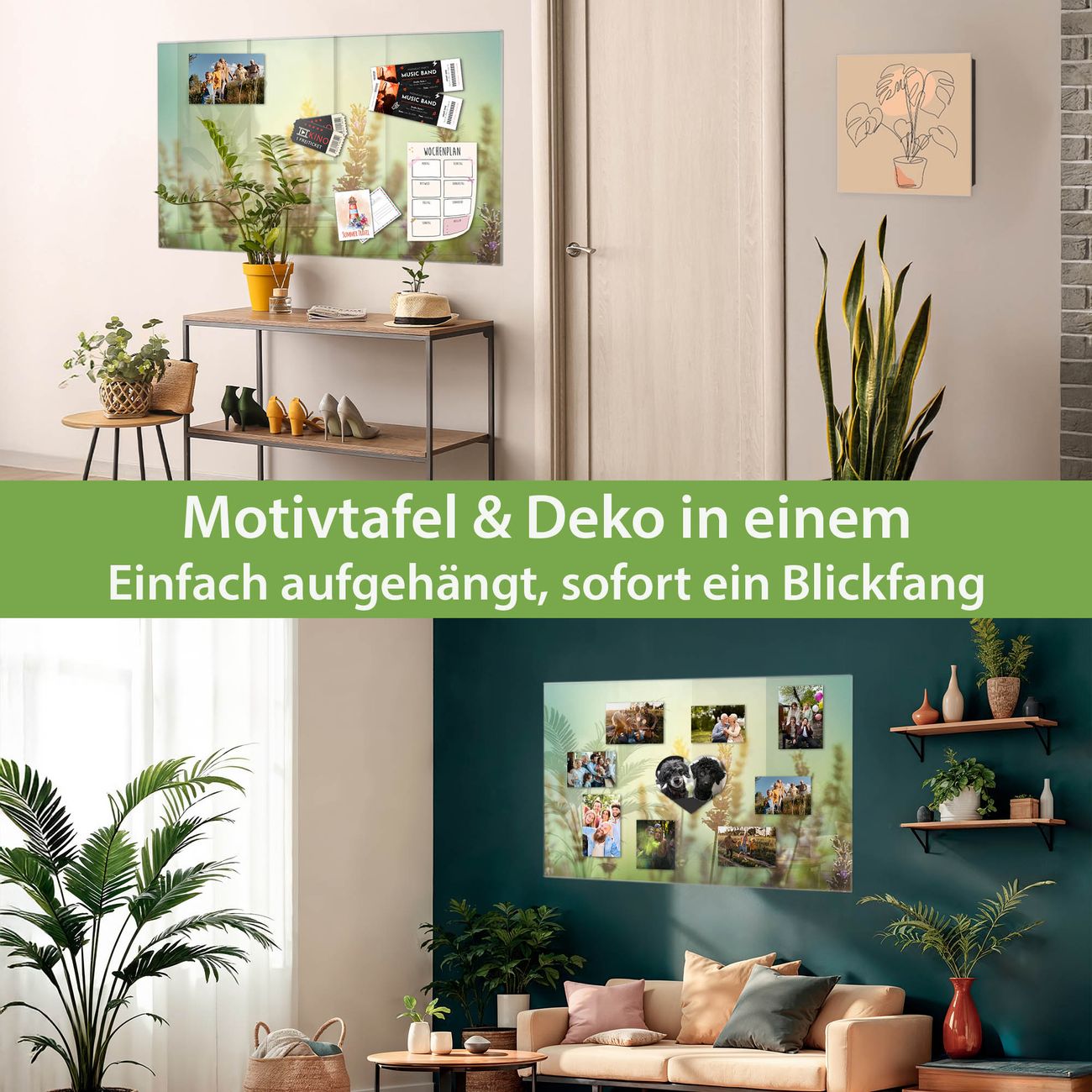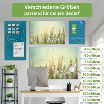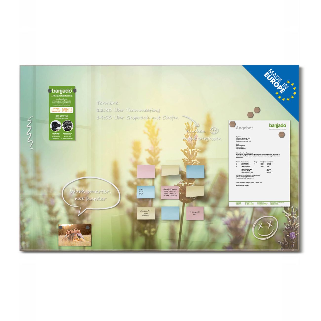 Material: 4mm Sicherheitsglas mit Metallrückwand Eigenschaften: beschreibbar, magnetisch, kratzfest Maße: 90x60x0,6cm, 8,10kg schwer Motiv Nummer 11622 Sonnenlavendel Zubehör: inklusive 4 Neodym-Magnete