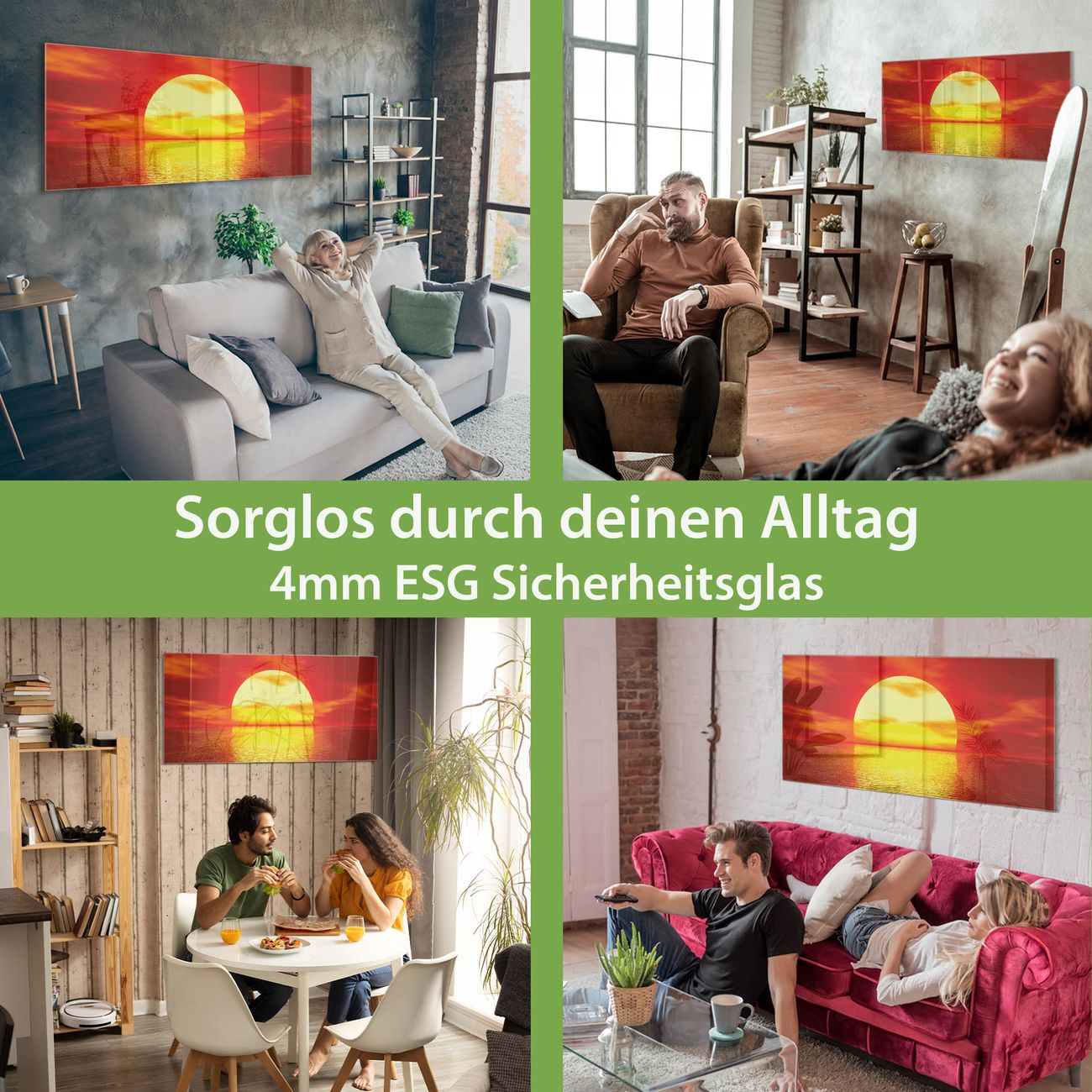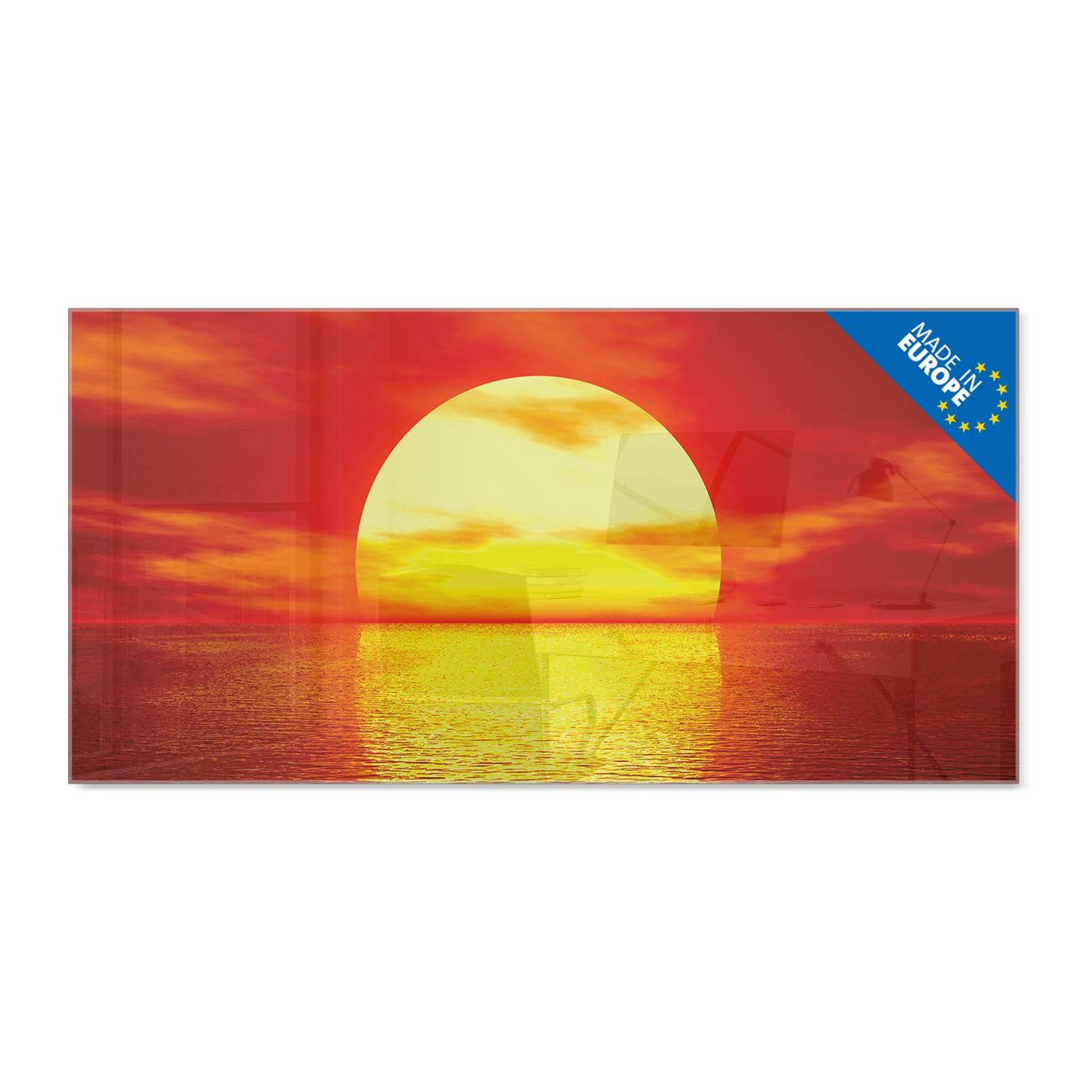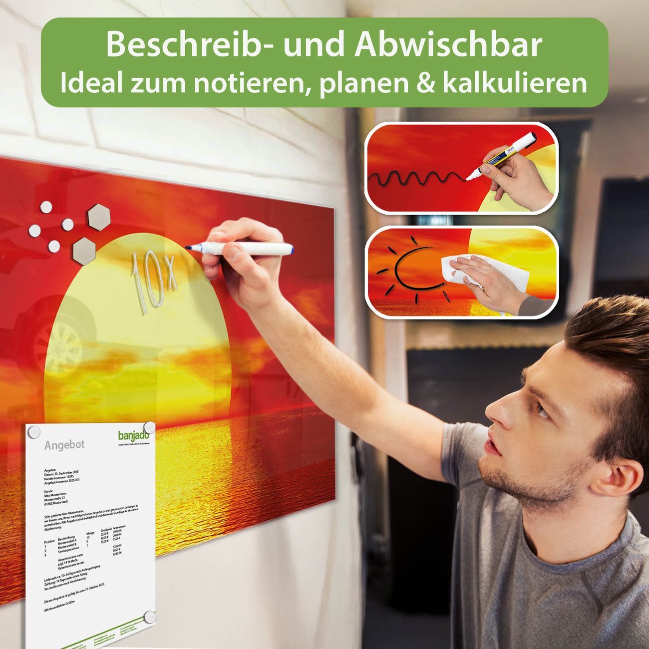 Material: 4mm Sicherheitsglas mit Metallrückwand Eigenschaften: beschreibbar, magnetisch, kratzfest Maße: 120x60x0,6cm, 10,80kg schwer Motiv Nummer 10023 Sonnenuntergang Zubehör: inklusive 4 Neodym-Magnete