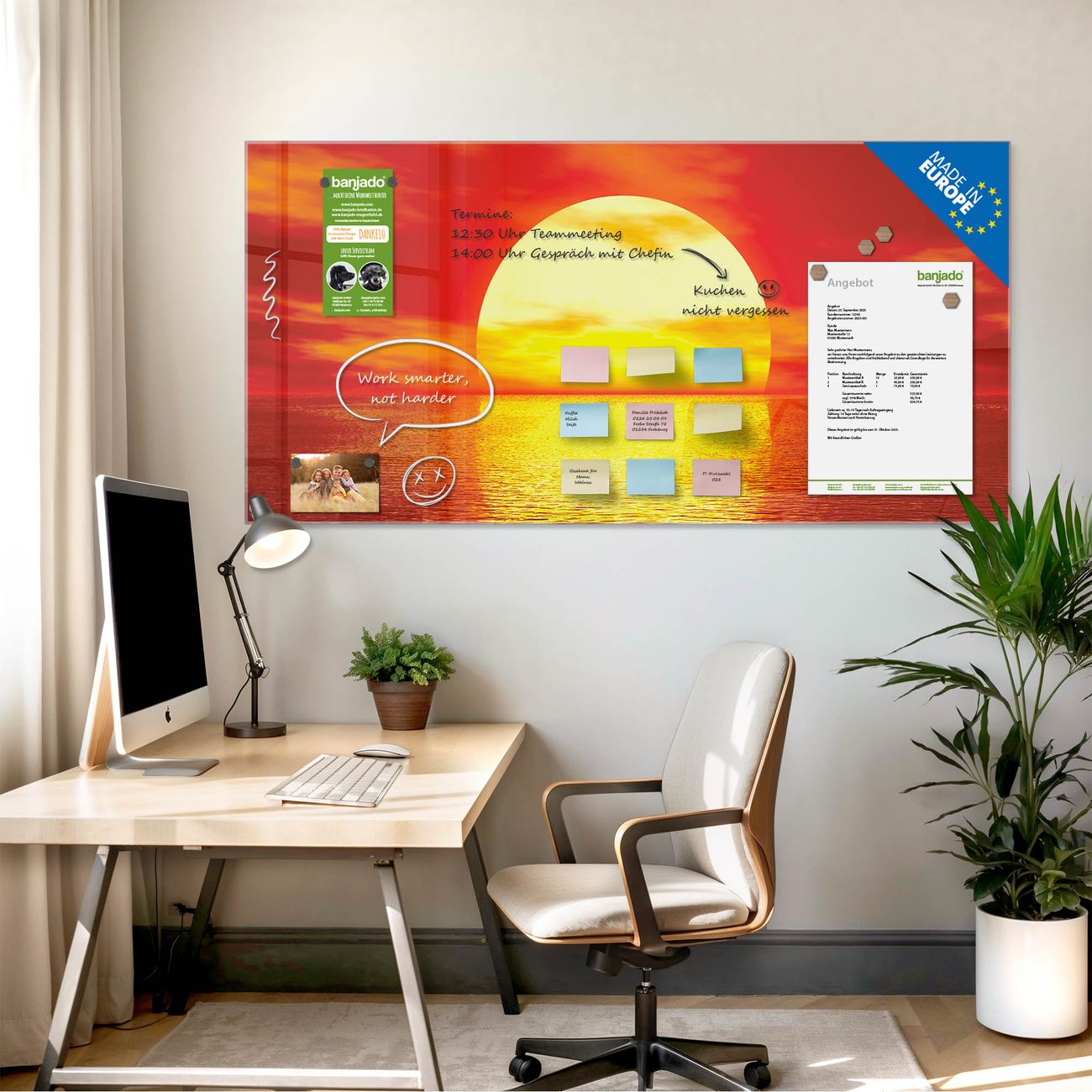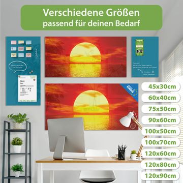 Die banjado Glas Magnettafel mit dem Motiv Motiv Sonnenuntergang verbindet Funktionalität mit Stil. Sie ersetzt das Zettelchaos durch klare Strukturen und bringt dabei eine warme, natürliche Atmosphäre in Ihr Zuhause. Ob im Büro, in der Küche oder im Eingangsbereich - dieses Design-Board zieht Blicke an und sorgt für Ordnung mit Charakter.