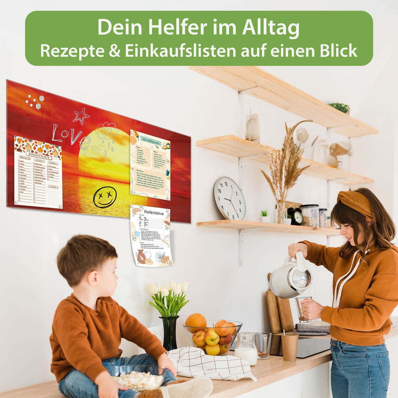 Ein Stück Design, das Ihren Alltag organisiert. Schreiben, heften, inspirieren - alles an einem Ort. Qualität, die man spürt. Montage leicht gemacht. Handwerk mit Herz - veredelt in Sachsen. Einzigartiges Design mit Motiv Motiv Sonnenuntergang Beschreibbare Glasoberfläche, leicht zu reinigen Starke Magnetkraft durch Stahlrückwand Inklusive 4 Neodym-Magneten Flexible Montageoptionen Handveredelt in Sachsen - Qualität, die bleibt