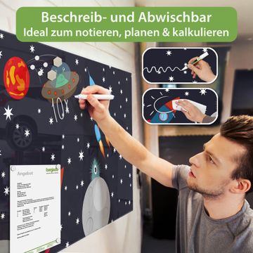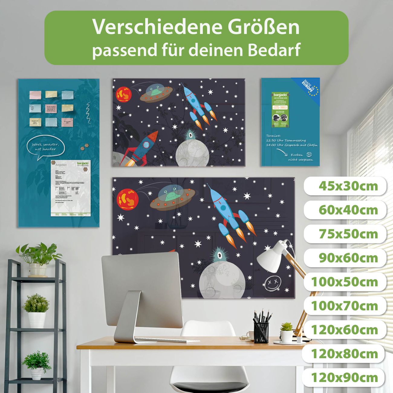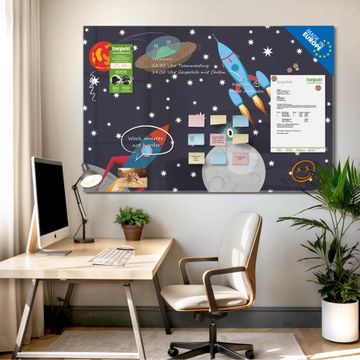 Material: 4mm Sicherheitsglas mit Metallrückwand Eigenschaften: beschreibbar, magnetisch, kratzfest Maße: 120x80x0,6cm, 14,40kg schwer Motiv Nummer 10401 Space Traffic Zubehör: inklusive 4 Neodym-Magnete