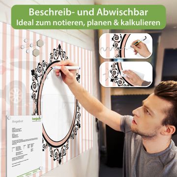 Die banjado Glas Magnettafel im Querformat mit Motiv Motiv Spiegel bringt Ordnung in Ihr Zettelchaos. Fotos, Termine, Notizen oder Rezepte lassen Sich hier stilvoll mit Magneten ordnen, so behalten Sie alles Wichtige im Blick. Das Memoboard aus Glas ist beschreibbar und wird Ihnen bereits mit 4 Neodym-Magneten geliefert. Das Format bietet Ihnen ausreichend Platz um alle wichtigen Informationen im Blick zu behalten.