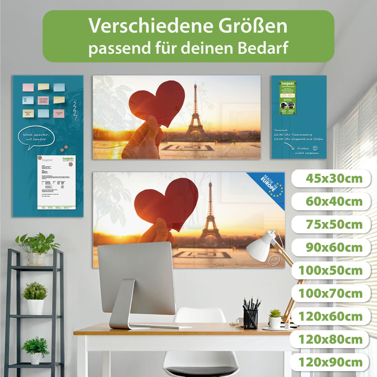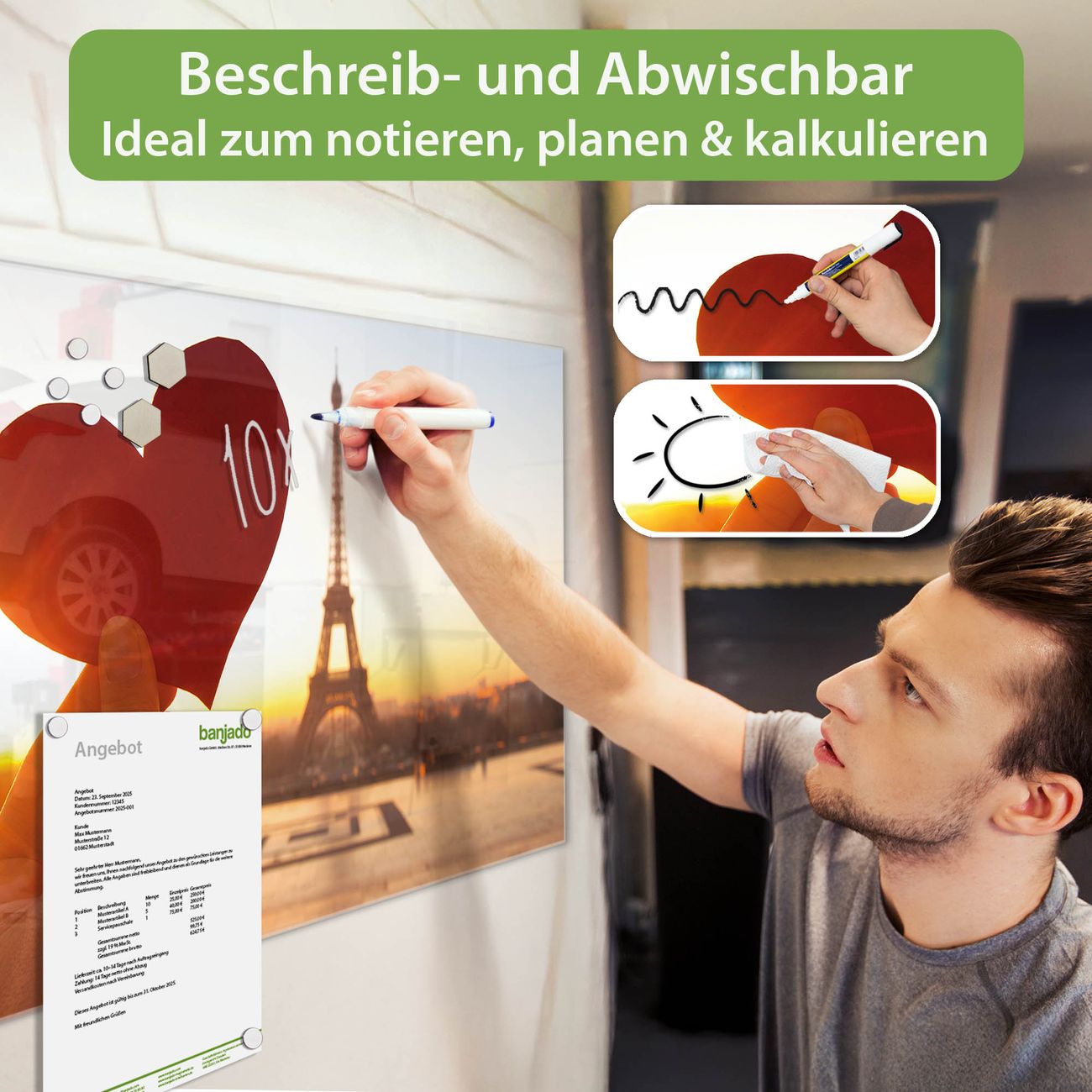 Material: 4mm Sicherheitsglas mit Metallrückwand Eigenschaften: beschreibbar, magnetisch, kratzfest Maße: 100x50x0,6cm, 7,50kg schwer Motiv Nummer 10808 Stadt Der Liebe Zubehör: inklusive 4 Neodym-Magnete